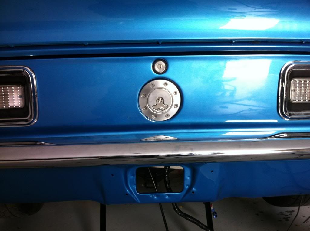 My car has been at the bodyshop since February for body work, and decided to paint the car its orginal color, which is Lemans Blue. The code is GM 71 and got the equivalent code from Dupont. I finally got the Aeromotive Fuel Tank installed as well as the Ridetech gas cap: http://i218.photobucket.com/albums/c...ps1b3cff09.jpg http://i218.photobucket.com/albums/c...psedcee75c.jpg I used the gas a cap a template for drilling the holes prior to painting the car; however, the gas cap appears to be a bit off center after the installation. |