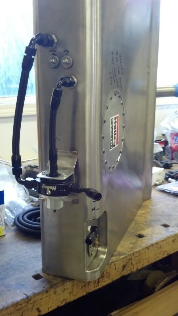 -65 Chevelle -98 LS1 mild rebuild, small cam, 36# injectors, stock fuel rail (returnless style), shorty headers, estimating 400 FWHP -Holley HP efi ecm -Early (earlier, not sure when it was made) Ricks SS tank -Holley 12-700 inline billet pump (intank) -Holley 100 micron pre filter (intank) -Holley regulator, mounted on outside of tank, return plumbed back to tank set at 44psi -6 AN flex line from regulator to chassis (~18") -3/8 hard stainless to firewall, 10 micron inline filter half way -6AN flex line from chassis to fuel rail (~24") -Holley 100psi pressure sensor mounted where Schrader valve was in fuel rail -Electrical: HP efi fuel pump output goes to a standard (mechanical switching) relay. That relay switches a ground that is passed to a solid state relay that switches the power to the fuel pump. The solid state relay was used as I plan on using the PWM output function of the HP efi someday. (could there be something here causing a problem??) Anybody use the "bulkhead" electrical pass thru like this? Seems odd having exposed electrical connectors submersed in fuel?? Some pictures, on the bench building it, shows regulator mounting: http://i1207.photobucket.com/albums/...ps230bb888.jpg view in tank. On the right side is a "U" tube (pump to prefilter), On the left is a pickup tube that goes thru a baffle wall in the tank. The return line also dumps the unused fuel in this baffled area (cavitation problem??) http://i1207.photobucket.com/albums/...3437989687.jpg I can get more pictures if anyone has any ideas...I'm not going to throw another $250 pump at it, I need to find the problem. I need some help here guys, I'm beside myself couldn't sleep last night. One week to Motorstate so I have to get this licked. Thanks in advance for any suggestions or comments :lateral: |