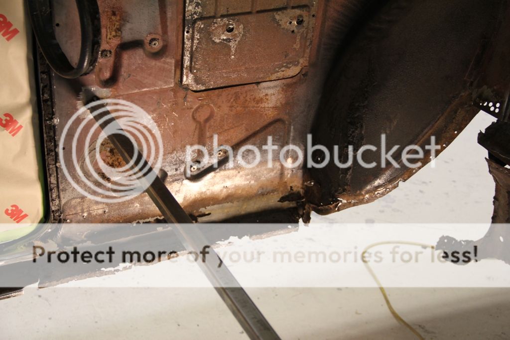 http://i563.photobucket.com/albums/s...psf719aa89.jpg The decision was made to replace the entire floor rather than fix all of the little spots around the car. So we braced the body and removed what was left of the original floor. http://i563.photobucket.com/albums/s...ps1f28dc7e.jpg http://i563.photobucket.com/albums/s...ps4cae6c86.jpg Next, we found the lower front of the passenger side quarter was pieced back together and nothing left to weld the floor or wheel houses to. http://i563.photobucket.com/albums/s...ps46433a91.jpg http://i563.photobucket.com/albums/s...ps08351c20.jpg |