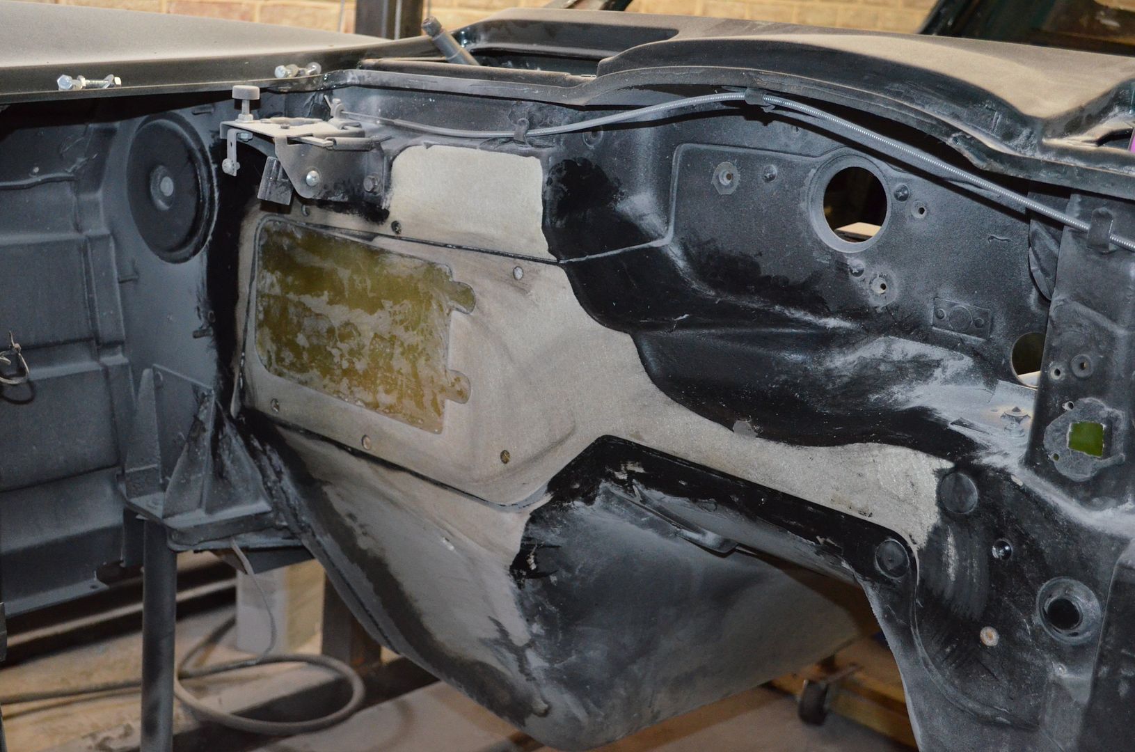 50 hours deep I was watching overhaulin' the other night and saw how they were using tape to create a form for fiberglass, so i tried it on the firewall where the heater box hole will no longer be necessary thanks to the newer vintage air unit. It worked well, but i ended up needing to still put a layer of glass on the backside for support. Clean slate http://i852.photobucket.com/albums/a...ps87736b88.jpg My opponent http://i852.photobucket.com/albums/a...ps36c6f62e.jpg Template for fiberglass mat made out of tape, which i then transferred to cardboard. http://i852.photobucket.com/albums/a...ps8f545c57.jpg http://i852.photobucket.com/albums/a...ps71c27ba4.jpg Firewall glassed in and sanded around area to be filled. http://i852.photobucket.com/albums/a...ps2f5a4fa2.jpg First skim coat of evercoat filler. http://i852.photobucket.com/albums/a...ps99bce3db.jpg 6/13/13 54 Hours Total New dolley came in yesterday. I assembled it this evening and mounted it under the car. No big updates for now. I've been busy hustling to get another car ready for paint, so i havent had time to work on the 63 this week. http://i852.photobucket.com/albums/a...ps3960c44e.jpg |