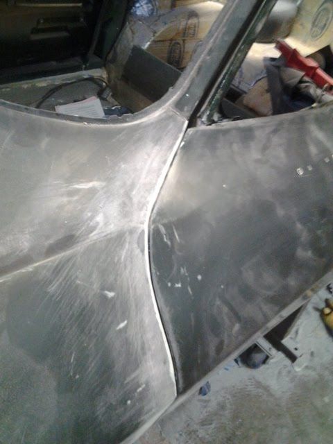 Finished narrowing the gap on the driver's side door and fitting the door to the roof, quarter, and fender. The door stuck out past the roof panel just in front of the indentations previously , but that problem is now resolved.