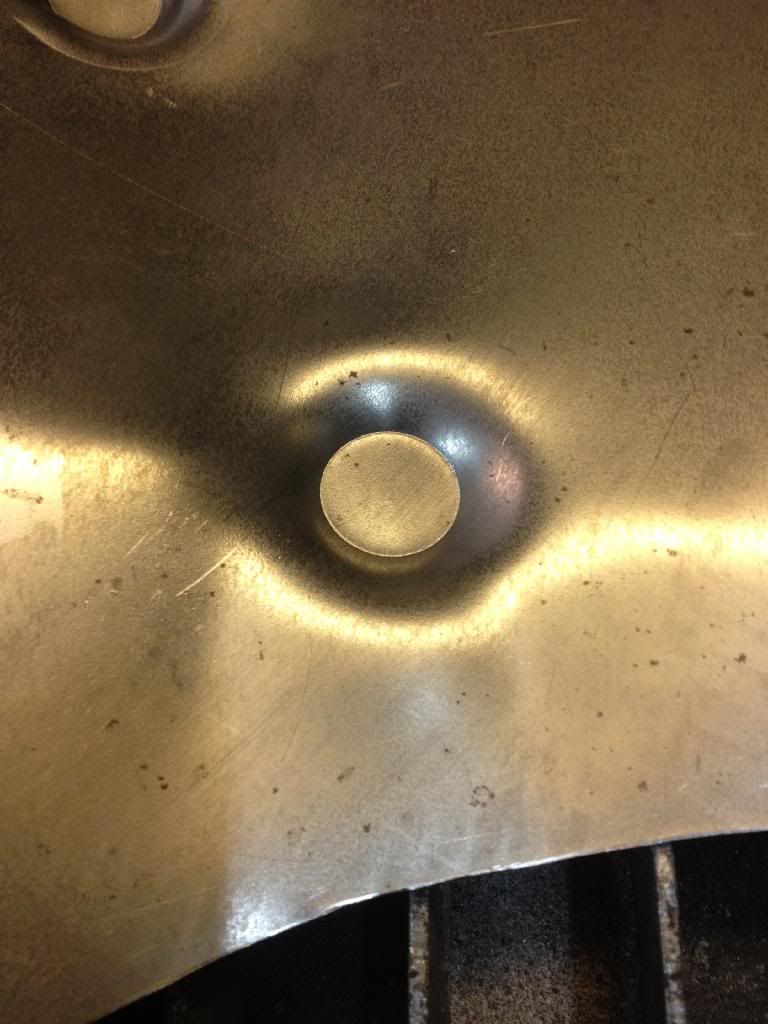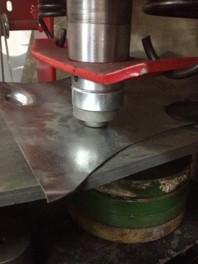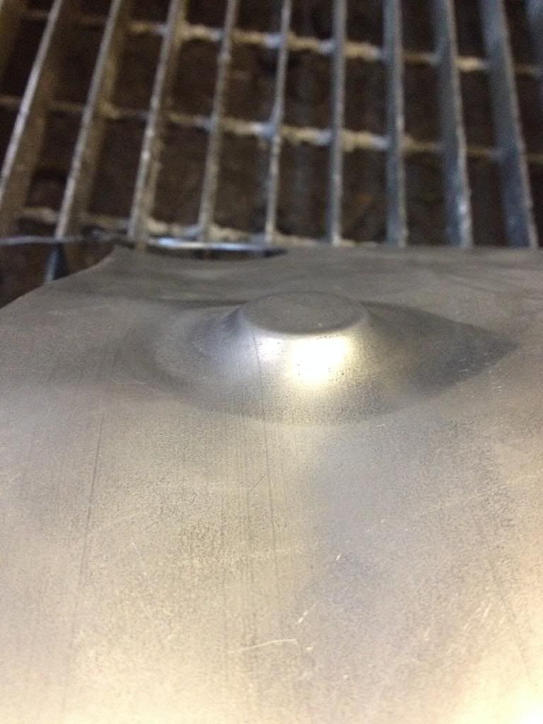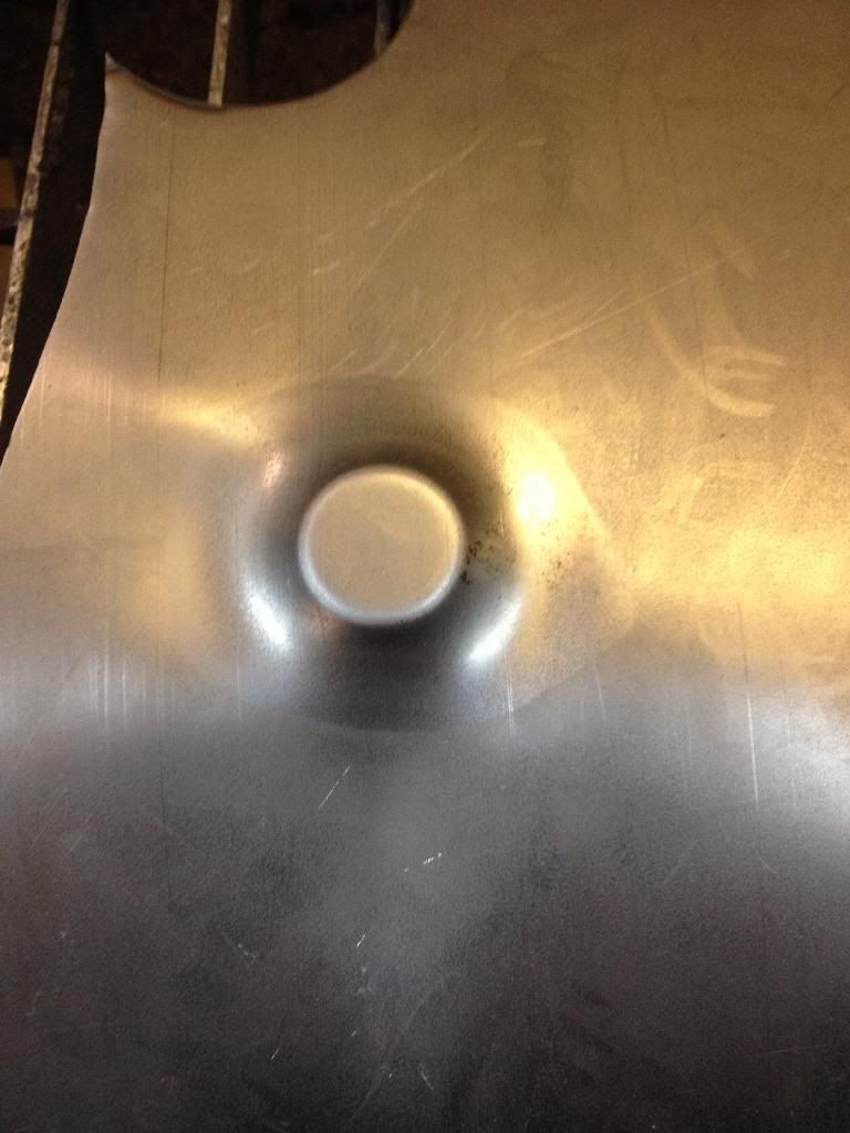 Use bigger dimple die at bottom and a sheet of rubber above that, then sheetmetal and smaller dimple at the top. To get best result you could strech the sheet first with english wheel just that small area where are you gonna press. I just tryed myself, used 1 1/4" bottom, 3/8 rubber ,20 gauge steel and 1" at the top. Its working pretty well even with out streching. Got a 1/4" deep but that would it even easier if I had wheel'd first. http://i1252.photobucket.com/albums/...ps4asvfhmo.jpg http://i1252.photobucket.com/albums/...ps28xfyxyr.jpg http://i1252.photobucket.com/albums/...ps3ruileay.jpg http://i1252.photobucket.com/albums/...pszwzum9mc.jpg http://i1252.photobucket.com/albums/...ps833jmswg.jpg http://i1252.photobucket.com/albums/...psx9oqbwfk.jpg |