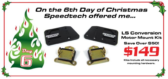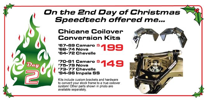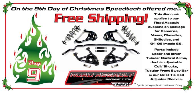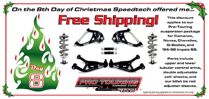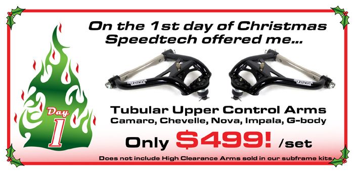 On the first day of Christmas Speedtech offers you... A pair of Tubular Upper Control Arms... OK, so maybe we weren't meant to sing in a choir, but at least we can help make your car sing around the autocross or road course. http://i1299.photobucket.com/albums/...psf802da64.jpg For day one of our 12 days of Christmas we're discounting our track proven tubular upper control arm sets. Our Made in the USA control arms are tig welded, remove weight, add positive caster, use stainless cross shafts and Delrin bushings, and come assembled with heavy duty ball joints. For today only, you can get our upper control arms for only $499. That's a savings of up to $100 off! Upper Control Arm sets are available for '67-81 Camaro, '68-79 Nova, '64-77 Chevelle, '78-88 G- Body, and '94-96 Impala SS. Phone Sales must be completed by 5:00 pm Mountain time, and online sales by midnight Pacific time. Click here to learn more... |