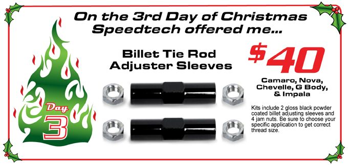 While the Elves at Santa's workshop are getting things all tied up for Christmas eve, Speedtech is also getting things tied up, with billet aluminum that is. For the third day of our 12 days of Christmas we've discounted our billet aluminum tie rod adjuster sleeves. These sleeves eliminate flex, stretch, and thread jumping that is common with factory sleeves. They also have a hex shaped center for easy adjusting, and keep your tie rod's ends sealed off which avoids corrosion and frozen parts.