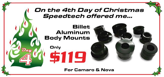 Rubber bushings dry out, crack, fall apart, and get just plain ugly. Bad bushings add to body roll and can make your car feel “loose” under hard cornering. On the fourth day of Christmas Speedtech offers you a great deal on tightening up your body mounts with our made in house Billet Aluminum Solid Body Bushings for your Camaro or Nova. Billet aluminum body bushings eliminate any type of flex between your car's body and frame and unlike poly bushings they won't squeak or change dynamics with temperature. Check out our Specials tab on our website for more information about Billet Aluminum Body Bushings for your car. http://i1299.photobucket.com/albums/...ps5a63e1ab.jpg This sale is for today, Monday December 15th only. Orders can be placed over the phone up to 5:00 pm Mountain time and up to Midnight Pacific time. Happy shopping! |