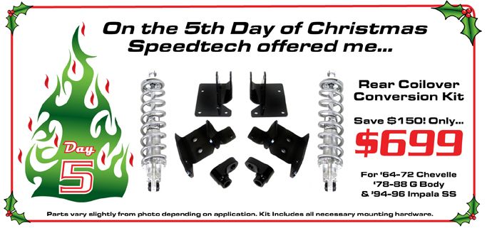 Santa's been checking his list and has had to check it twice! He's noticed many A body, G body, and Impala SS owners have been nice, having done all the tricks up front and replaced their rear trailing arms to get a better handling car. But the naughty ones still haven't properly addressed rear springs and shocks. For the 5th day of Christmas Speedtech offers a kit that'll put those of you that are guilty back on Santa's nice list at an amazing deal!