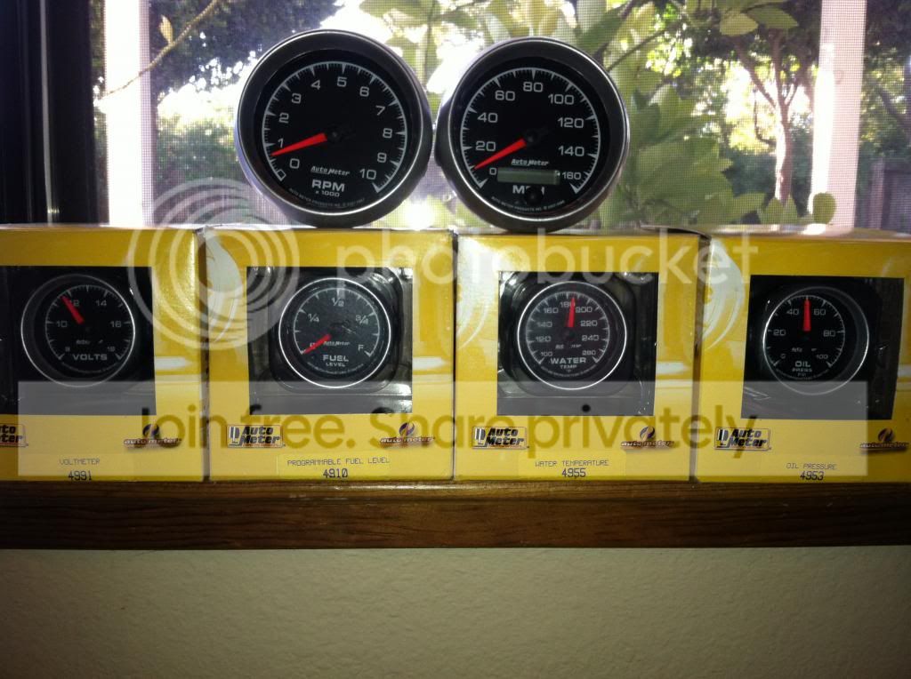 Price:$550 Description: I bought these from another member but unfortunately they won't fit in the panel I bought. I'm bummed because these things are beautiful. These gauges are over $1100 from Summit and come with instructions, new sending units, and boxes for the four small units. The tach and speedo are loose, but in perfect condition. All of the ES series gauges I have seen are encased in a black outer ring, but these are silver. If they have been painted, I can't tell because they look so crisp. http://i394.photobucket.com/albums/p...ps234ef8c0.jpg 5991-volts 5910-fuel 5955-water 5953-oil pres. 5988- Speedo 5977-Tach $550 plus the ride. I take paypal. |