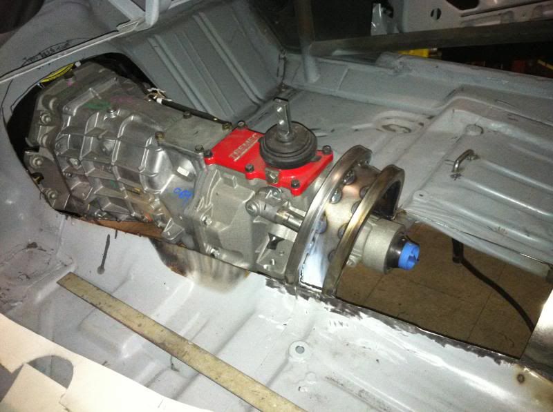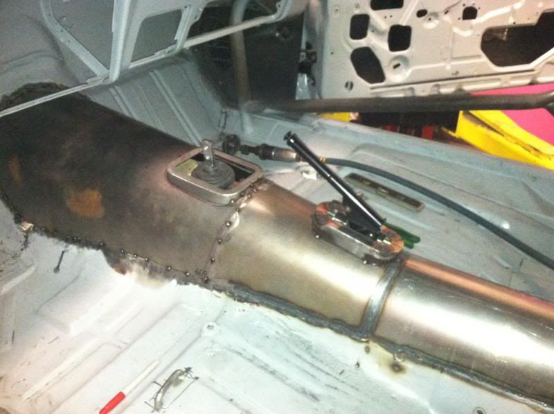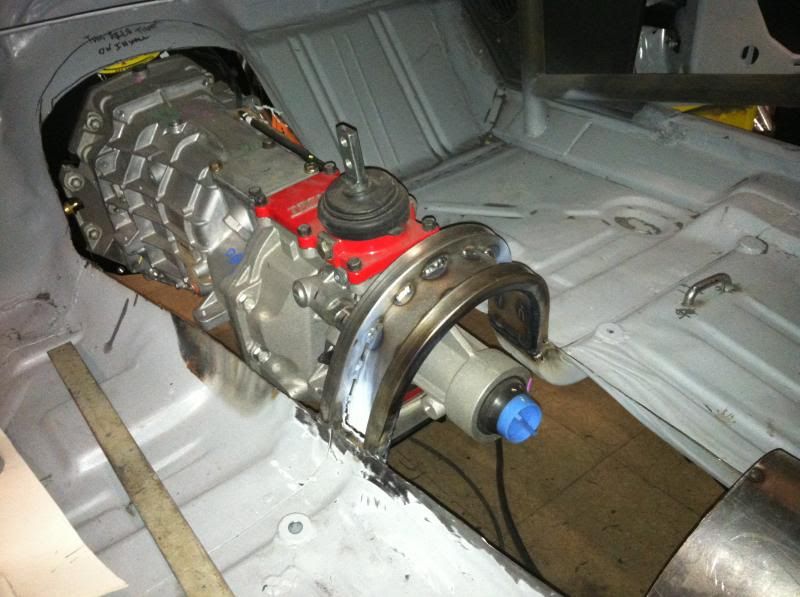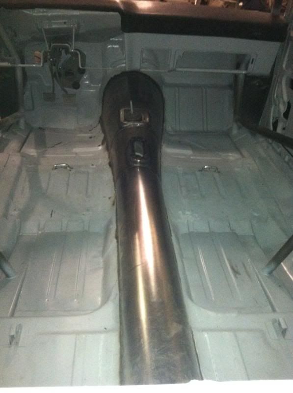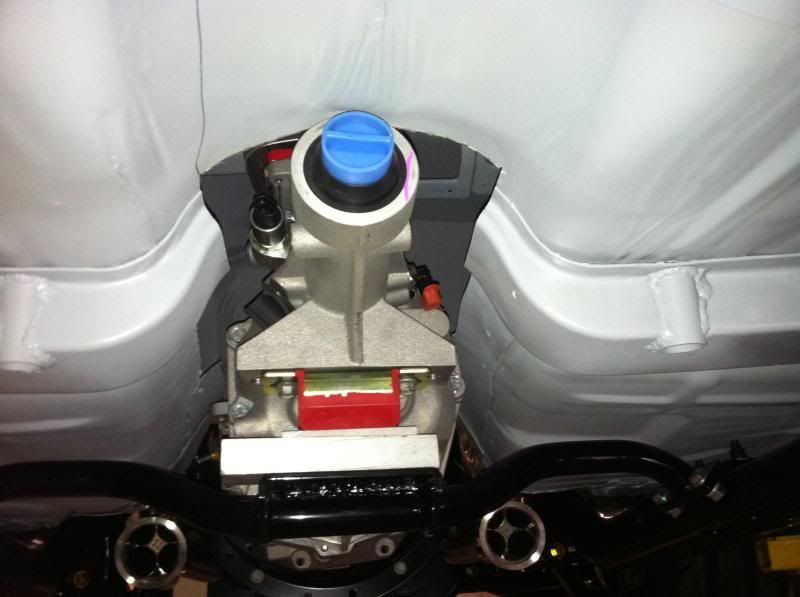 Trans tunnel complete with shifter box and E brake mount, new Trans X member built, billet relocation blocks machined to relocate the steering column from the granny position and new fron fiber glass clip parts getting fitted. Also fabbed up a new ATL fuel cell mount for the rear body panel.