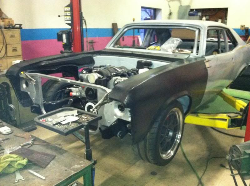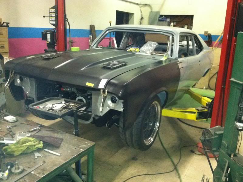 I found this car and it looked pretty good, but of course like all cars of this era, it had the usual rot in the rear 1/4's - outer wheel house. So I knew that all had to come off. The plan is to build the car around the track proven Detroit Speed front subframe and suspension and their Quadra-Link rear suspension. It is being powered with a 7.0 Liter Katech engine with a T56 Magnum trans. The rearend consist of a 9" housing, Mark Williams Pro Mod aluminum center section with a WaveTrac diff and 3.90 gear. The outer housing ends are from Mark Stielow and use C6 ZR1 hub pack bearings. The car has a ton of fabrication work to accommodate all of the mods. I modified the DSE wheel tubs to give me a 14" wheel house that can fit a 345 tire on a 12" rim. Lowered the height between the body and frame, added a full chrome moly cage, welded up the firewall, added DSE frame connectors and added a SCCA approved ATL fuel cell with protection cage. I am currently cutting the entire trans and driveshaft tunnel to fit the T56 along with the adjusted engine and pinion angle changes. Lowering the car to Billy Utley low required the entire drivetrain to be readjusted. The body received some upgrades with all new sheet metal in the rear, door skins along with fiberglass hood, deck lid, front fenders, cowl panel and front and rear bumpers to lighten it up a bit :D This thing should be an absolute blast and provide excellent safety at higher speed events. Oh, and since this thing has beat me up everyday and has stolen all of my lunch money....Thug seemed like a good name for it Ha ha. R/ Jeff http://i29.photobucket.com/albums/c2...psf80f124d.jpg http://i29.photobucket.com/albums/c2...psaadc52d3.jpg http://i29.photobucket.com/albums/c2...psba11cf9b.jpg http://i29.photobucket.com/albums/c2...ps8d89ecf0.jpg http://i29.photobucket.com/albums/c2...ps5893a098.jpg http://i29.photobucket.com/albums/c2...ps6de3b083.jpg http://i29.photobucket.com/albums/c2...psc1f4c5f9.jpg http://i29.photobucket.com/albums/c2...ps5a1bb46a.jpg http://i29.photobucket.com/albums/c2...psaf5c7e92.jpg http://i29.photobucket.com/albums/c2...ps284c2642.jpg http://i29.photobucket.com/albums/c2...ps7d992b3b.jpg http://i29.photobucket.com/albums/c2...ps5d342e7e.jpg http://i29.photobucket.com/albums/c2...psbaf3cbb8.jpg |