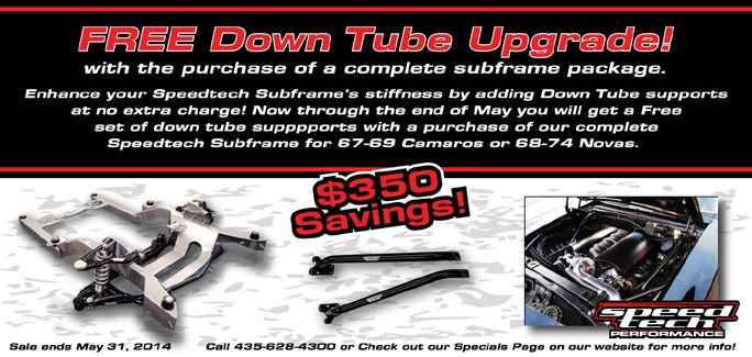Ready to order a complete new subframe for your 67-69 Camaro or 68-74 Nova? Well there's no better time than the present! Speedtech offers one of the best values on the hottest complete front suspension package on the market, and during the month of May this great value gets even better! Order before May 31 and we throw in a set of Down Bar braces absolutely free! That's a $350 savings! Down bar braces bolt to the rigid corners of the firewall and then on the frame rails near the upper control arms for race car like rigidity and looks. Click this link to learn more about our Chassis Down Bar Braces. Click this link to learn more about our complete Pro Touring Subframe for '67-69 Camaros. Click this link to learn more about our complete Pro Touring Subframe for '68-74 Novas. |