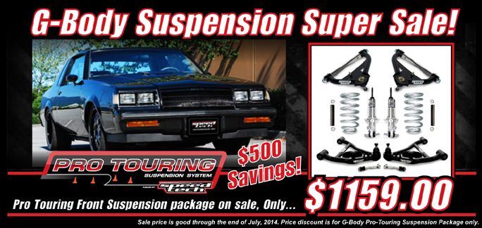 OK All you G body guys- this one's for you. As a G body owner I'd sure like to see more of us taking the honors on race day. It's time to get rid of that lame factory suspension and save some cash in the process. Speedtech has our G Body Pro Touring front suspension package on sale for $500 off through the month of July. It's time to see more G bodies turning quick times through the curves.