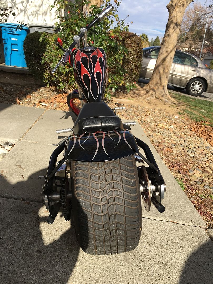 Description: Default CMB Custom Mini Bike Chopper Item Location (City/State):Vacaville, CA Price:$1500 Description: I'm thinking about parting with my mini chopper. It was made by a company a while back called CMB (Custom Mini Bikes). Tank & rear fender are metal, front is plastic (I think), 6 hp Tecumseh with pull and electric start. The paint is equal to what you would have on a full size chopper. As you can see lots of chrome and powder coating, rear disk brake, headlight works. New these things were expensive 4-6k range of course before all the imports hit the market. No Shipping is this thing is near 7ft long. Not street legal in CA Local pickup is required http://i1197.photobucket.com/albums/...s9bzfhwjr.jpeg http://i1197.photobucket.com/albums/...ssq4nvgfi.jpeg http://i1197.photobucket.com/albums/...sva3jyjak.jpeg http://i1197.photobucket.com/albums/...sc16jezky.jpeg |