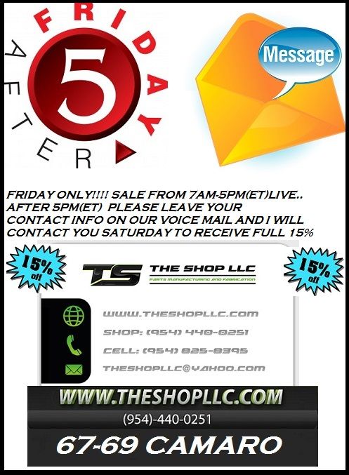 https://www.facebook.com/pages/The-S...03853559705438 https://www.facebook.com/pages/The-S...03853559705438 https://www.facebook.com/pages/The-S...03853559705438 FRIDAY ONLY!!!! SALE FROM 7AM-5PM(ET)LIVE.. AFTER 5PM(ET) PLEASE LEAVE YOUR CONTACT INFO ON OUR VOICE MAIL AND I WILL CONTACT YOU SATURDAY TO RECEIVE FULL 15% OFF FULLY WRAPPED 67-69 CAMARO KICK PANELS WITH ONE PAIR OF FOCAL ACCESS 165AC 6.5" SPEAKERS.. FRIDAY ONLY!!! SUPPLY IS LIMITED SO DON'T MISS OUT!! 954-440-0251 KICKS, 25 SETS, TRAYS 20, SUB ENCLOSURES 20.TODAY 7AM-5PM COME AND GET EM!! 15% OFF ALL 67-69 CAMARO KICK PANELS, ENCLOSURES, TRAYS, SUB WOOFER BOX'S,RAW WRAPPED OR TEXTURED FINISHES 15% OFF WHILE SUPPLIES LAST!!! FRIDAY ONLY 7AM-5PM 954-440-0251 CELL 954-825-8395 http://i281.photobucket.com/albums/k...LC/AFTER53.jpg http://i281.photobucket.com/albums/k.../HEREWEGO1.jpg http://i281.photobucket.com/albums/k...-69MASTER1.jpg https://www.facebook.com/pages/The-S...03853559705438 http://i281.photobucket.com/albums/k...DAYWRAPPED.jpg http://i281.photobucket.com/albums/k...PLLC/JEFF2.jpg http://i281.photobucket.com/albums/k...CKS2014048.jpg |