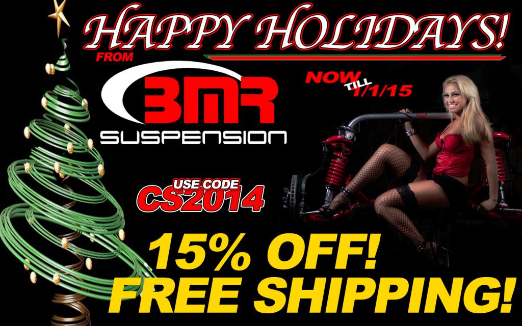 BMR Christmas Sale - 15% OFF most BMR Suspension products BMR would like to say thank you to all of our customers on this family-oriented holiday by having a 15% OFF Christmas/New Year’s Sale on most BMR products until January 1st at midnight. Viking shock and strut kits will also receive 10% off. Free Shipping and No Handling Fees for domestic orders (lower 48 states only). Same day shipping on most orders!!! Parts are in stock and ready to ship! Sale applies to both red items and black hammertone items! Oversize charge ($10) applies to K-members, subframe connectors, and sway bars. Product can be ordered at the sale price from any of our authorized distributors and dealers. Product can also be ordered directly from BMR by clicking here and using code CS2014 at checkout : http://bmrsuspension.com/?page=products Unfortunately, the following items only get 5% OFF on this sale : GTO drivetrain products, 1st and 2nd gen F-body torque arm suspensions, manual steering conversion kits, manual brake conversion kits, 3rd gen coil-over conversion kits. No discounts on packages….just order each part individually to receive your discount (up to 10% off package price). Merry Christmas to you and your family from everyone at BMR!! |