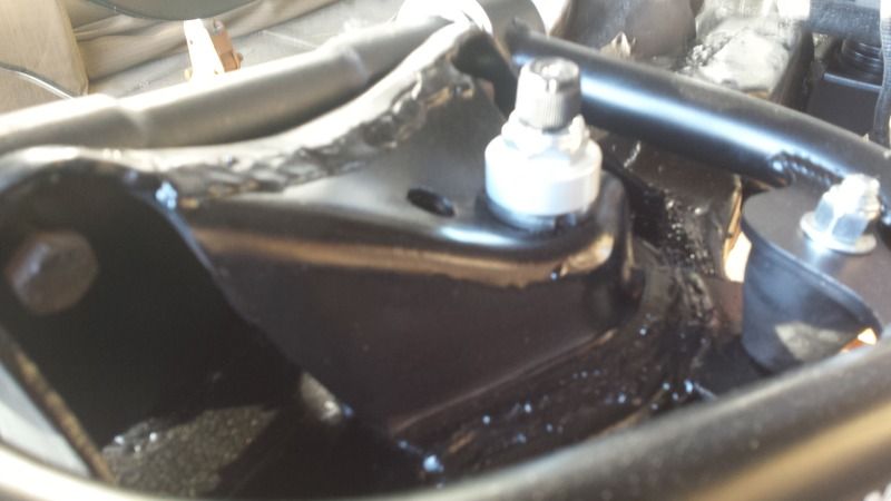 I bent the shock mount back to its original location tonight compared to the drivers side. Not sure how one gets bent down and in. But it did. Also apon further review of the instructions ride tech states you may have to clearance the spring bucket for the coil over. Guess I missed that page. The coil over would bolt into the right hole in the lower control arm after the shock tower was where it was supposed to be but I still added some more space with the dremel. Still thinking of adding some gussets since the pass side shock tower has got to be weaker now being bent twice. |