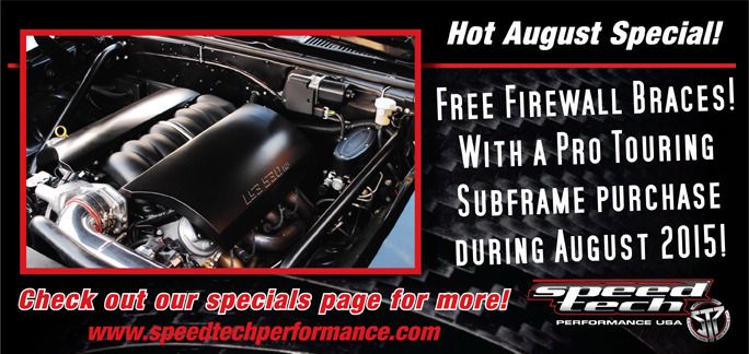 When you purchase a Speedtech Pro Touring subframe kit you're already getting a fantastic value in upgrading your suspension to top level performance. But we don't want to stop there! To help stiffen up the structural rigidity of your car we have a matching set of firewall down tube braces that tie our subframe into the rigid corners of your firewall. Through the month of August this normally $349 brace kit comes FREE with the purchase of a complete Pro Touring Subframe purchase. Please check out our specials page by Clicking HERE to learn more about this great deal! Don't miss out on this great opportunity, call us at 435-628-4300 to get your order in by August 31, 2015! Retail customers only please. |