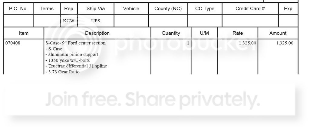 Price:$1250.00 Description: I am considering selling my 9" housing that was purchased from DSE. The only reason I'm considering selling is I may switch to a floater set up. I'd rather sell this complete, but if it doesn't sell I will cut the ends off and use it for the floater. It has been painted Satin Black with Standox products by Dutchboys Hotrods. It has no miles and has only been used for mock up. I also have a Center Section that is currently installed in the housing. I didn't plan on selling the center section, but if someone would like a complete package I will let them go together. Below are pictures of the DSE invoices with full specs. I would like $1250 for the housing with axles or $2500 complete. DSE will sell the rest of the Quadra Link package separately. http://i470.photobucket.com/albums/r...psbanhgsyb.jpg http://i470.photobucket.com/albums/r...pshpglizaj.jpg |