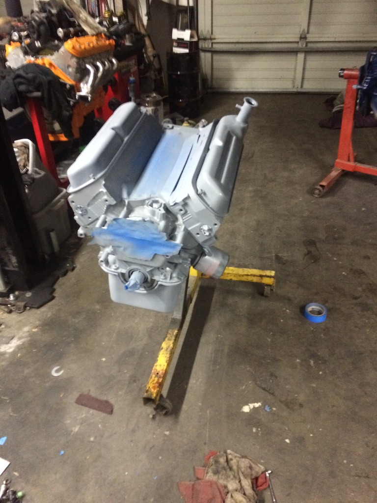 The other 5.0L is destined for a 1963 Ford Falcon. I figured if you have to wait 10 minutes between coats and you're running the shop heater anyway, you might as well make use of the time and the heat to get two done at once.