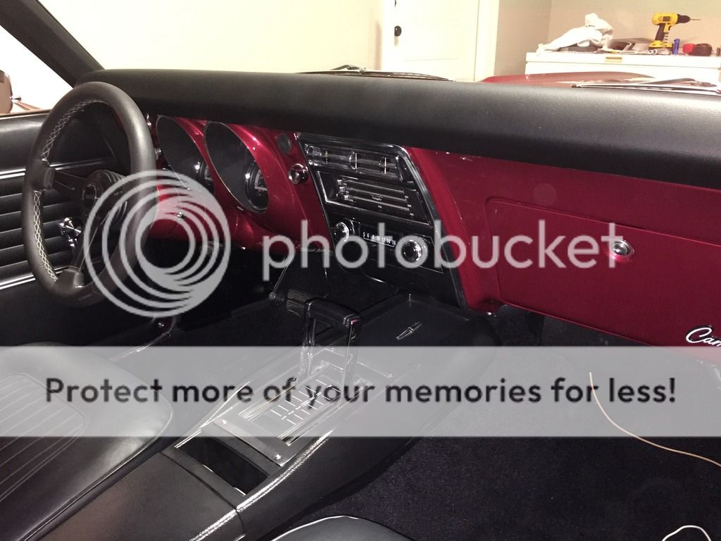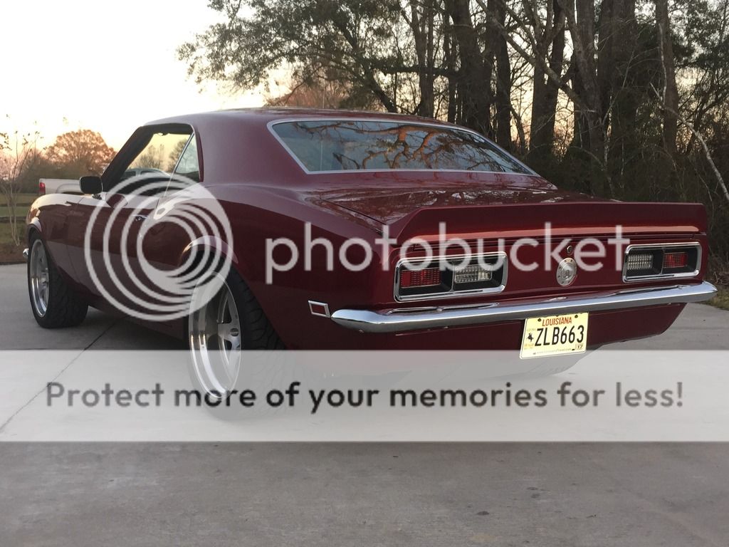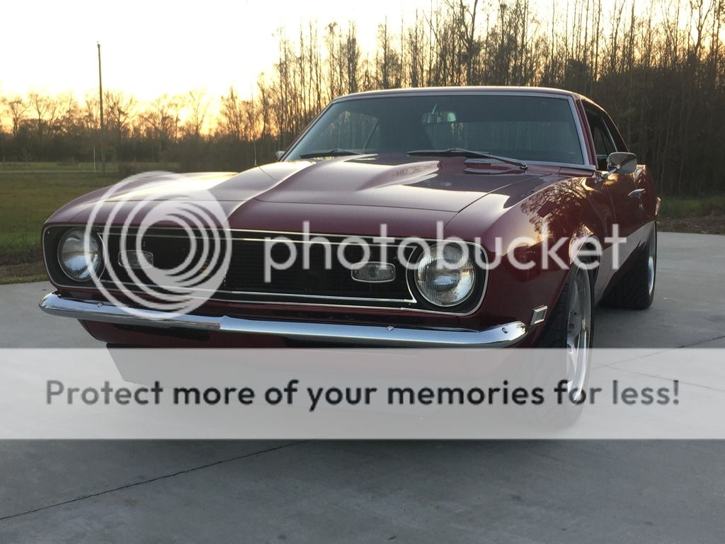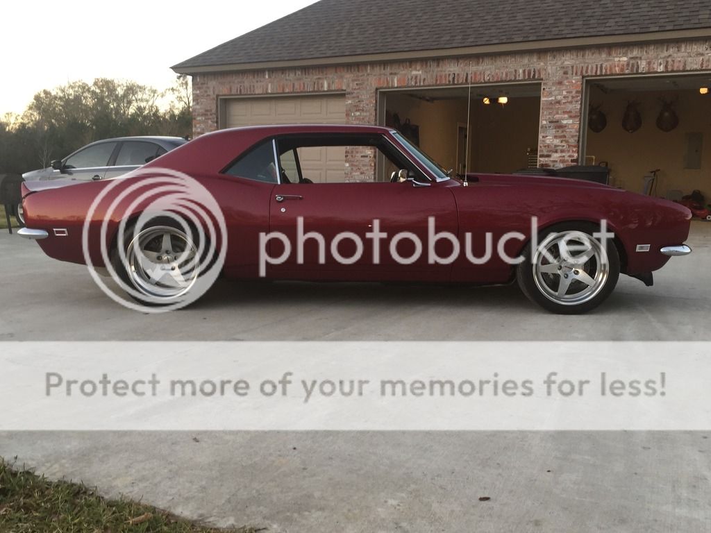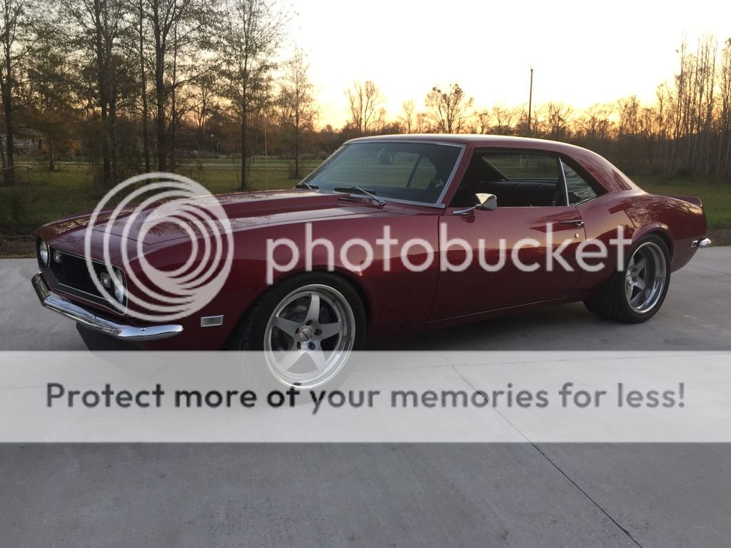 So just a quick summary...... 1968 Camaro Color: Electric Currant Red Engine: 2008 6.0L LS, L92 heads, LS3 intake, Cam (226/234 .612"/.629" 112 LSA), 98-02 F-Body accessories....417rwhp Transmission: Custom built 4L65E with B&M transmission cooler Wheels: Forgeline SO3's brushed/cleared centers, polished outers Front 18x8's with 245/40/18 BFG's Rear 18x11.5 with 335/30/18's BFG's Suspension: Rear - Chris Alstons G-Link Front - Stock subframe with Chicane coil over conversion Rear End: Moser narrowed 12 Bolt with 3.73's Brakes: 13" Track series front and rear Interior: Stock Body: DSE Tubs DSE subframe connectors New floor, trunk, quarters, roof skin, tail panel Misc: Vintage Air Gen IV Stainless Works Headers Flowmaster 2-1/2" 40 series mufflers Retrosound Radio Performance Rod & Custom radiator with twin electric fans ....In a nut shell, it's all brand new, including every nut and bolt. The only thing left is to rename it. "ITDORUN" was the old license plate I had on it 23 years ago when I was 15 and it's time to retire it. http://i531.photobucket.com/albums/d...t/IMG_1278.jpg http://i531.photobucket.com/albums/d...t/IMG_1280.jpg http://i531.photobucket.com/albums/d...t/IMG_1285.jpg http://i531.photobucket.com/albums/d...t/IMG_1283.jpg http://i531.photobucket.com/albums/d...t/IMG_1259.jpg http://i531.photobucket.com/albums/d...t/IMG_1248.jpg http://i531.photobucket.com/albums/d...t/IMG_1249.jpg http://i531.photobucket.com/albums/d...t/IMG_1047.jpg |