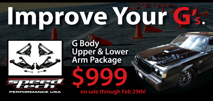 Hey G body guys- For the whole month of February we're combining our upper and lower G Body front control arms into one package at a great price- Only $999 for the set! You get all the great features found in all of our control arms- CNC mandrel bent tubing, TIG welding throughout, geometry enhancing design in both uppers and lowers, stainless cross shafts offset machined with two camber setting options, near bullet proof Delrin bushings, heavy duty ball joints, and they come assembled and powder coated gloss black. Click Here to learn more or order yours today, hurry this sale ends February 29th! Click Here to order our free 2015-2016 Catalog. To answer any of your questions or to place an order for any of our suspension or LS & T56 swap parts call us at 435-628-4300 or visit our website atwww.speedtechperformance.com. |