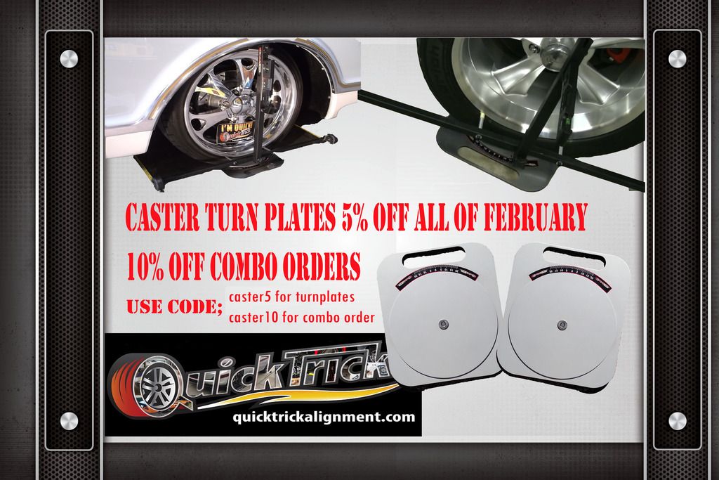 We're currently offering our new Caster turn plates at 5% off, and combo orders with any alignment system at 10% off. http://i1042.photobucket.com/albums/...psr1nyf0ml.jpg Our February give away winnner, Cory Browning is another Pro-Touring community member. Cory has been building his Monte Carlo SS for the past twelve years now. Powered by a cammed 350, with vortec heads. A C5 brake set-up, and a UMI stage 4 front suspension. Congrats, Cory! We hope the QuickTrick system can help bring more success this season. http://i1042.photobucket.com/albums/...ps4yhiebl0.jpg We also attended the Mac Tools Tool Fair at The Mirage in Las Vegas. A lot of great people in attendance. Here's a shot of our booth! http://i1042.photobucket.com/albums/...ps2vskkwlc.jpg |