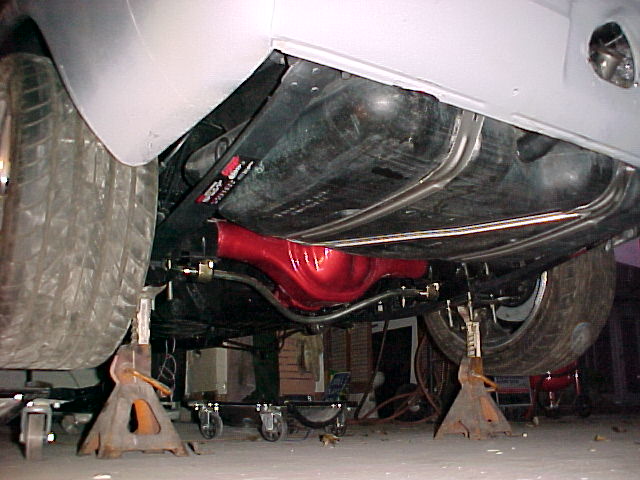 -Ford 9" housing mated to custom length axles housings. -3.5 gears -Moser (sp?) 31 spline axles -Outer hub mated to LS1 4th gen Camaro mount for direct bolt on 12" rear brakes -I whimped out and decided NOT to tub the car. Went with a custom length of the axle which was basically 2.5" wider on each side than stock. This is also the same width as a 4th gen Camaro. -This allows me to run any stock wheel from a 1988-2004 Vette or LS1 Camaro in the rear. "IF" I had done the DSE tub I could run the 2005 Vette wheels which are 1" wider per side in the rear. Was also able to transfer the e brake straight from the LS1 2002 Camaro by cuting and welding the mount to the side of the shackle mount. It rolls right into the stock 69 e brake mount on the subframe. Only had to lengthen the rod that comes off the passenger sub frame by 6" to get it all to perform perfect. -Spring is a VB&P fiberlgass -Edelbrock Shocks http://www.mcspeed.homestead.com/fil...nch_test_2.JPG http://www.mcspeed.homestead.com/fil...rear_brake.JPG http://www.mcspeed.homestead.com/fil...connection.JPG http://www.mcspeed.homestead.com/files/fuelcell2.JPG |