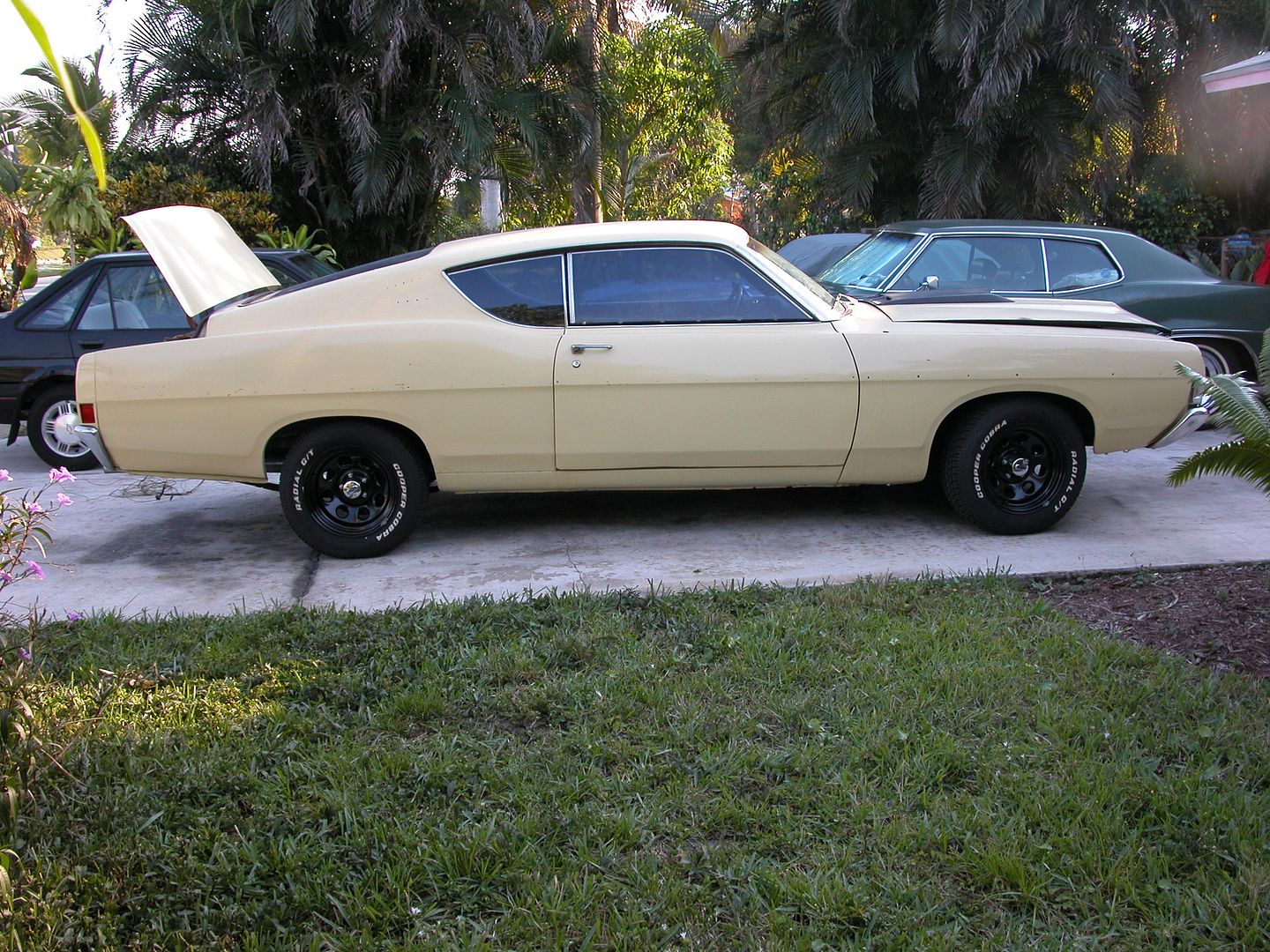 Here is something I found on google that represents what I am thinking about for stance and color. I do want to put the vinyl top back on, and I have the trim. I took the side trim off because I wanted to de-chrome the car, and somewhat make it unique to the Torino world. Too many GT's this year look the same. I have a 68 and I have been converting it to 9 tail lights because they have a slight slope to them and no side markers. |