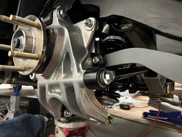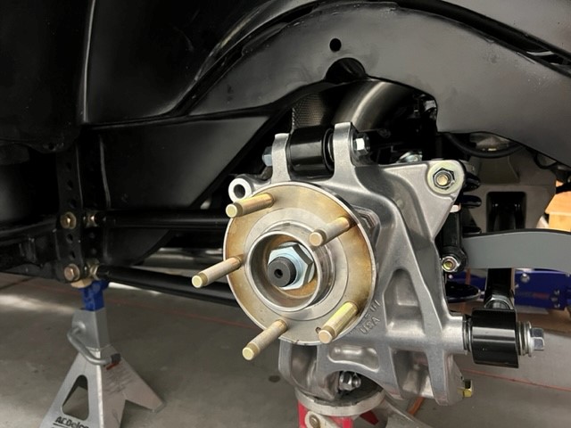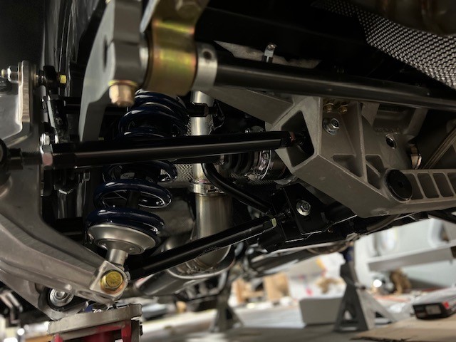 For those who might be interested in a strong, adjustable, multi-link rear suspension, here is my conversion of the DSE Decalink (designed for a C-2/C-3 Corvette) to a C-1 Corvette chassis. I believe it could be adapted to most chassis with a little fabrication of the crossmember and forward link pick-up points. The Decalink uses JRI multi-adjustable shocks, C6 brakes, and a proprietary differential with Chevy 12-bolt internals.