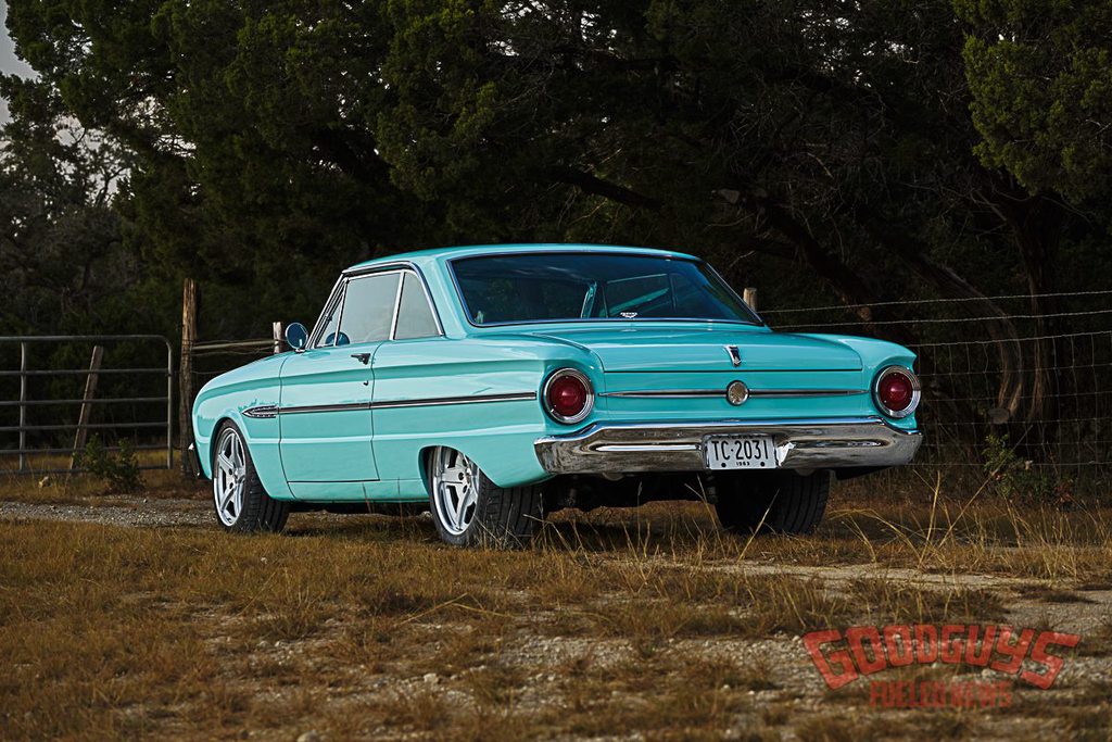 Rust bucket. Grant Smith's 1963 Ford Falcon was a corrosion nightmare, before being completely resurrected by the team at Cruzer's Customs. It's powered by a 450HP 5.0L Ford Performance Coyote V8 mated to a Bowler Performance Transmissions 4R70W 4-speed automatic transmission and rides on a custom front suspension, RideTech 4-link rear suspension, Baer disc brakes, Michelin tires, and 18x5.5/18x9.5 Forgeline forged three piece Rodster wheels finished with Hyper Silver/Diamond Cut centers, Polished outers, and Polished center caps! See more at: https://www.forgeline.com/customer-g...-smith/cgk2867