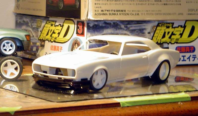 http://i113.photobucket.com/albums/n...o/100_0430.jpg http://i113.photobucket.com/albums/n...o/100_0431.jpg http://i113.photobucket.com/albums/n...o/100_0436.jpg http://i113.photobucket.com/albums/n...o/100_0437.jpg http://i113.photobucket.com/albums/n...tormockup1.jpg Now I’ve decided that the front end isn’t what I want so I’m changing that a little, and the back end a little. Bodywork mods thus far include- First time adding flares to the back fenders Trying to get rid of lower side reveal(taking a while to get it just right..never will I use a dremel to remove side trim..lol) Molded in trunk lip spoiler made from kit back bumper Front lip spoiler shown here made from kit front bumper but has since been taken off and something else will be used The hood, interior bucket(race style with no back seat), tail lights, and grill are all resin items from a great little company called reliable resin. I’m also using an lt5 engine from an AMT Wagon rod ( I wanted a dohc GM motor) and it has a scratched up hilborn efi style induction set up The interior will get a 69 dash, simply because I had a spare and its better detailed than the amt 68 dash, and a set of either c5 corvette seats or r34 skyline seats with a roll bar and harnesses. Wheels will be the American Racing 200s style as shown in a few pics. I was thinking about the salt flat special style wheels but they look a little more like show car instead of race car to me. The exterior color will be a medium red metallic shot over a gold or silver base, the interior might be something weird after seeing a color combo I liked on the internet on a Porsche Cayman, if not then it will likely be a mix of darks red and browns. Wheels will either be bronze or titanium colored centers wirh chrome or aluminum lips. I’ll be working on this one a while since I’m trying out some new stuff and I want it to look pretty good when done. Anyway what do you guys think? Odd huh..lol Comments and critiques are welcome. Thanks Gray |