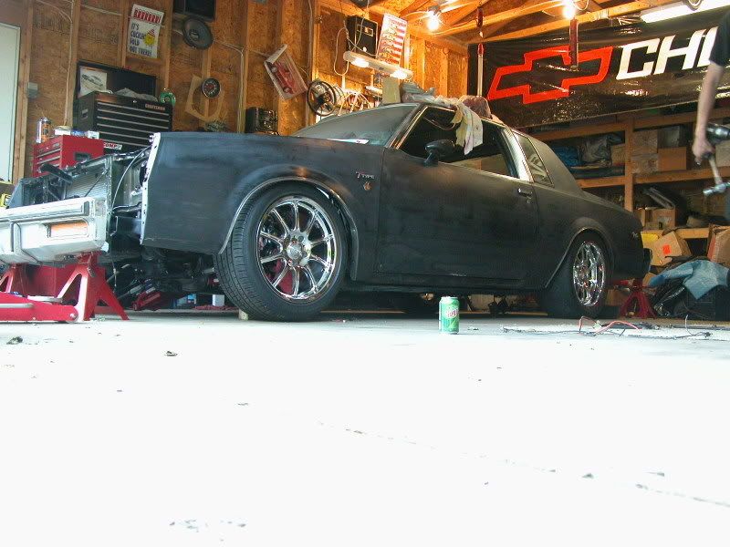 Well, its been a while since the last update. I have completed the rear suspension except the sway bar, WAITING FOR SC&C. The front steering and suspension as almost complete as well. I ordered my Corvette calipers and brackets from Kore 3 and my pads from Hawk. Right now the fromt wheel is just sitting in place, wanted to see how it would look. I spent most of the day today hammering and cutting in the rear wheel tubs to get the 295's to fit, and now they do. I had to cut a little of the wheel well trim to get the tire to tuck, but not enough you would see it clear as day. So, I sould have to car rolling by the end of the weekend and on the road shortly after I hope. Then next winter it gets to come back apart for body work. Here are some pics.