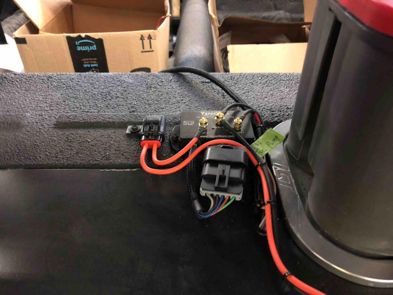 We also got the catch can mounted. Went with a Mighty Mouse catch can. Will connect via a -8AN adaptor on the valve cover oil filler. We had to modify the fuel rail cover - drilled a hole and will connect a 90 degree elbow fitting with push lock hose that will connect to the catch can. Other line out of the catch can will plug into nipple on the intake manifold.