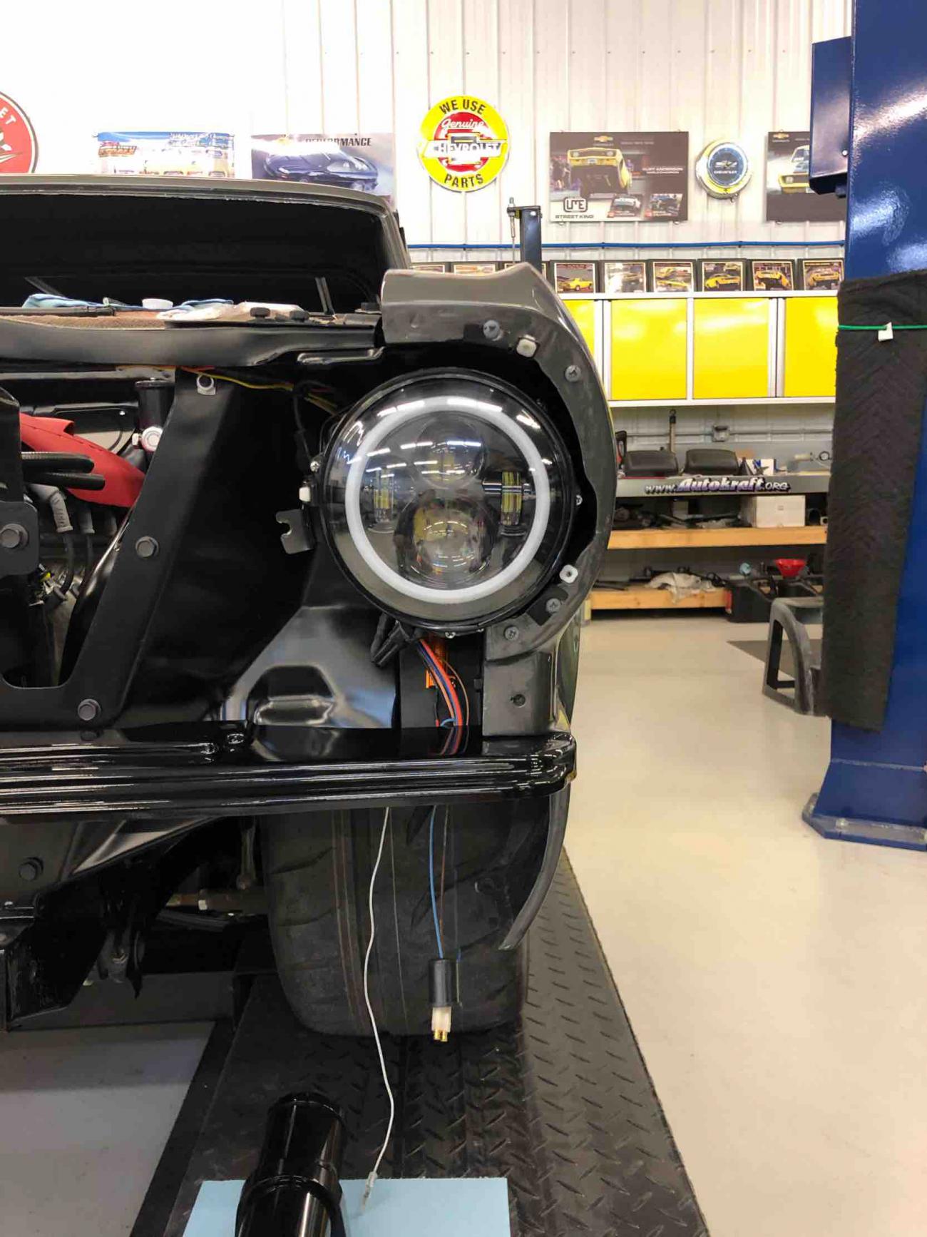 The headlights are also mounted and wired up. These headlights are LED units with halos. The halos shine white most of the time, so they serve as daytime running lights when headlights are off. When the headlights are on, I can either leave the halos on or switch them off - I have them wired to a virtual switch on the Holley pro dash. When turn signals are activated, however, the halos shine amber and blink with the turn signals. Pretty cool, and excited to see them in action.