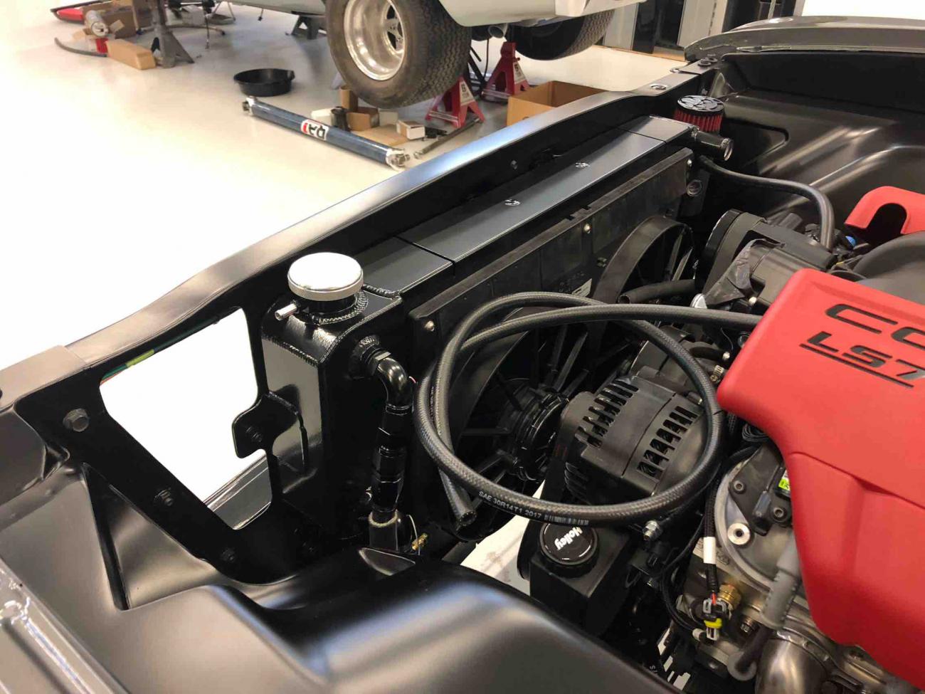 Got a nice view of some of the wiring that was done under the car. I mentioned previously that the C6 Corvette PWM fan unit is wired with a nice splitter harness from Vintage Air that splits the output signal from the fan control unit in two into pigtails that plug directly into the Spal fan pigtail harnesses. Works awesome... we will need to secure the harnesses so that they don’t block the air flaps in the shroud, but is super clean.