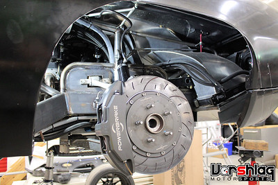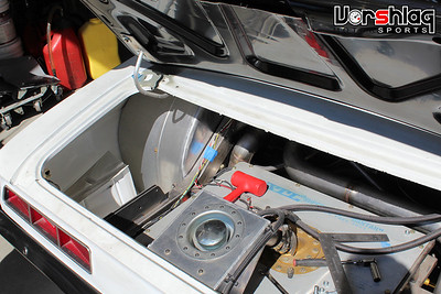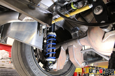 The front shocks mount at the bottom like any C6 Corvette damper, with the "T-bar" lower mount that attaches to the lower arm. The "eye" upper installed to a mount on the frame we had added before and built towards. The reservoirs are mounted under the hood - I will show more of that in a later write up.