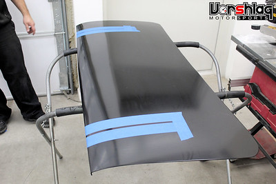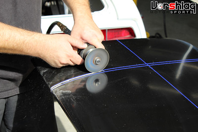 There was no rear trunk latch anymore and that part of the trunk had been cut out. The uprights were installed and so was the trunk, and it was time to mark where the slots would be...