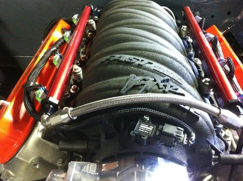 Ok so may photobucet is down..hate that sometimes anyway.. Been really pushing on the car could have done it with out the help from family, friends, John over at psi and Carl at vaporworx..both great companies to work with. For the first start the car would run 2-3 seconds and stall. We then scanned for codes and where getting cam and crank. After talking to John we realized the cam signal was wrong and fixed it, again thank you John. The car then fired but was running rough...realizing there is two large vacuums at the back of the manifold that need to be plugged. Once those where closed with my buddies finger here's what we have...