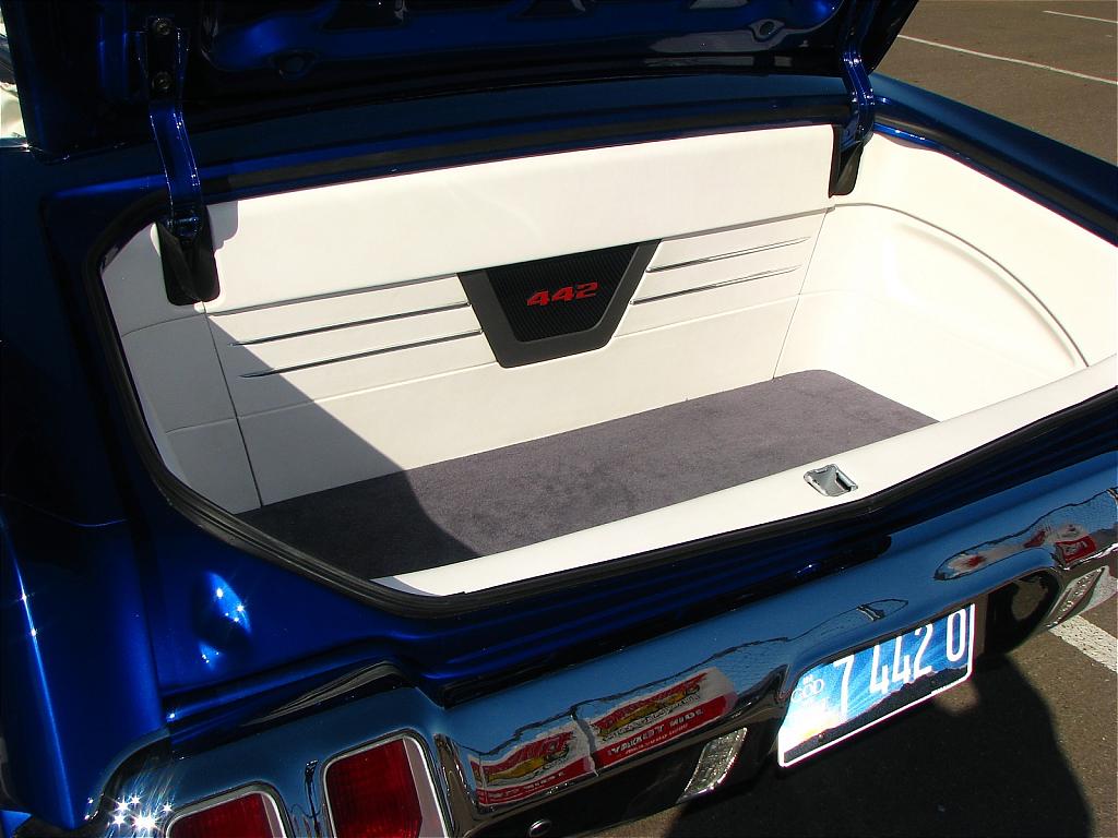 INTERIOR: The interior was designed by the private owner and Riddler Award winner Paul Atkins. This national level show interior is finished in white leather with grey inserts. The triple layer center console with rear waterfall and carbon fiber front area is a first for Atkins. You will notice the original his and hers Hurst shifter with a leather late model shifter handle. A Clarion marine sound system is mounted in the carbon fiber console area along with the new high tech touch screen of the ISIS system. This system operates 90% of this Oldsmobiles electronics by computer. There is no longer a fuse box in this Oldsmobile. Four bucket seats with 6 way power front seats. The dash is Paul Akins complete custom with carbon fiber inserts and carbon fiber dash cluster. The carbon fiber face gauges are by AutoMeter and illuminate blue. This interior has a tilt wheel, power 4 wheel disc brakes by SSBC, Vintage Air A/C AND Heat, power steering, power windows, power top and cell phone charger in the console along with the USB connection for laptop use with the ISIS system. The final touch in this interior is the Nardi leather wrapped steering wheel. The trunk is an extension of the Interior featuring a carbon fiber insert with 442 emblem and stainless steel spears matching the interior design.