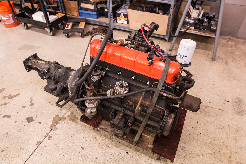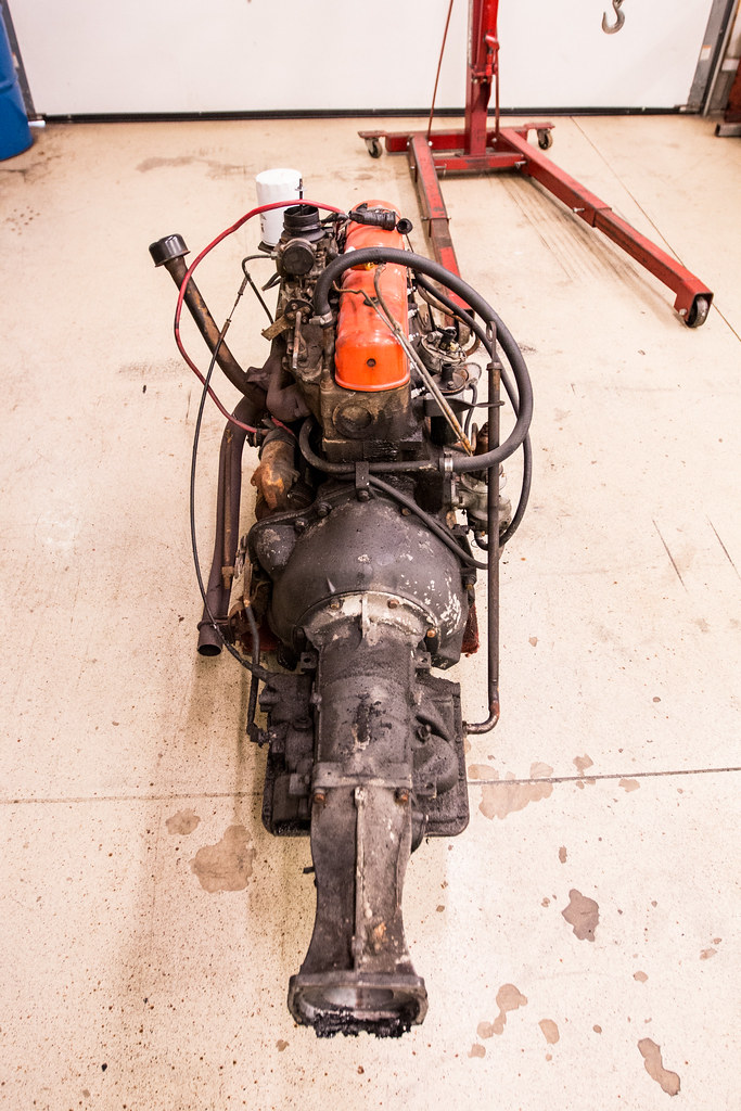 Progress so far: obtained the new driveline components, removed the old heavy cast iron I-6 and transmission from the Rambler.