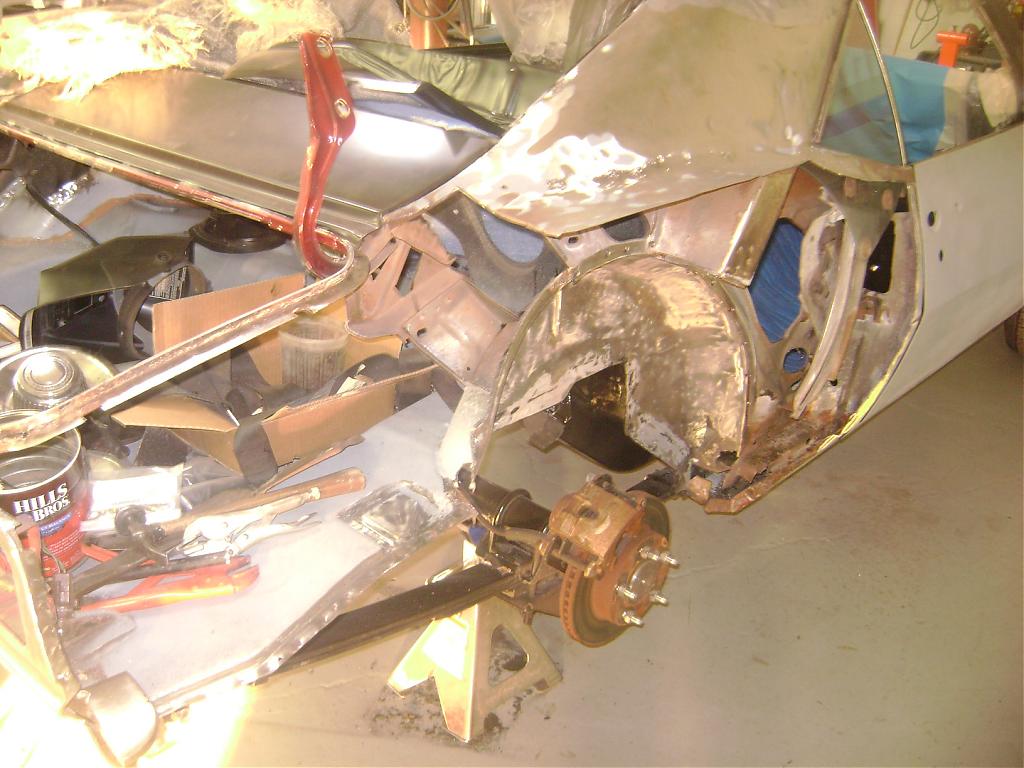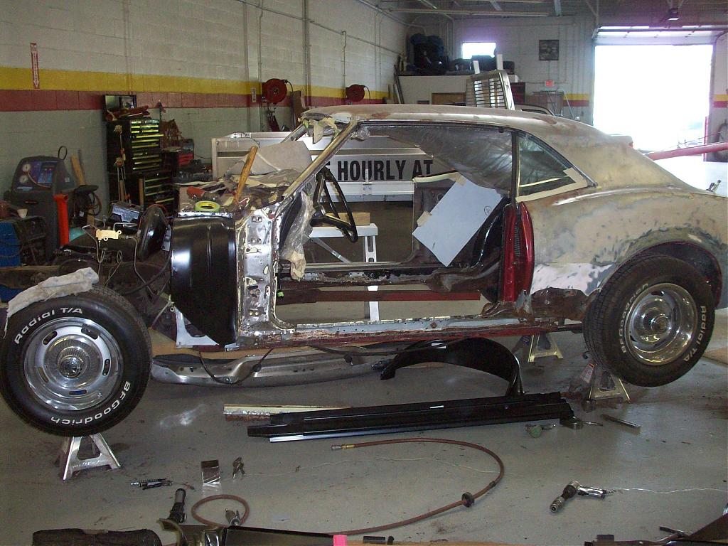 So, WTF am I building? Started out with a steaming turd I bought about 10 yrs ago, a black 68 Camaro coupe with a vinyl top and with a 210 HP 327 and a powerglide. Paint was all spidered and it had manual drum brakes all around, but the interior was nice, so I thought it was restorable. I didnt know squat, except for the fact that I wanted a Camaro, preferably 69 because I was born in that year, but on an impulse I ended up with the 68. Stripped it down and had it media blasted, and did the unthinkable, handed it over to Maaco for a cheap paint job and some rust repair. Left it that way for 5 yrs, swapped in a 383 and a TH350 and lowered the gears from 3:07 to 3:73. Then I got cute and had some guy my brother know add 76 Trans Am disks all around and then we put in lowered springs front and rear and put in solid mounts. The brakes were horrible and the car was a bigger rattle box than ever before, and now the tires rubbed constantly. So I ditched the car in a garage for 4 yrs, got married and had two kids and rebuilt our duplex loft in downtown Chicago from the studs in, and still made enough trading to tackle restoring my old heap. And in the meantime, guys like Detroit Speed and Alston and Art Morrison and Wilwood took off from where Gulstand and Hotchkis and Global West started out, and gave all of us a reason to breath life into these beautiful old cars other than concourse restorations. Gave her to Corpo Collision in Schaumburg, Illinois with a referral from a friend who restored cars but was too busy back in October of last year. Was just going to put in a front clip and get the metal restored and painted. They had a 57 Bel Air with an Art Morrison full frame about halfway done, and my imagination took off. The head guy there, Nick, has been helping me since, doing as much research and helping me handpick EVERYTHING down to billet washers. And yes, Im bleeding out. I should have got some sponsors. This is anything but cheap. About two weeks away from paint and a month and a half from getting her on the road after 4 1/2yrs.