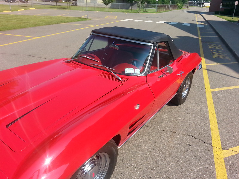 The car was repainted by my grandfather at least 20 years ago(who is a body man by trade), but the paint is still in great shape. It had some custom black painted in the fender vents and hood vents that is subtle, but contrasts very well with the red paint. There are some imperfections in the paint, but overall great condition. There is absolutely no rust on the frame and the body has never been in any accidents. Everything is very straight and clean on the car. The chrome and the emblems are all in good condition, and there are two missing pieces of trim from the pictures but we do have them. The lower trim piece on the outside and inside of the windows. The convertible top is also a newer install.