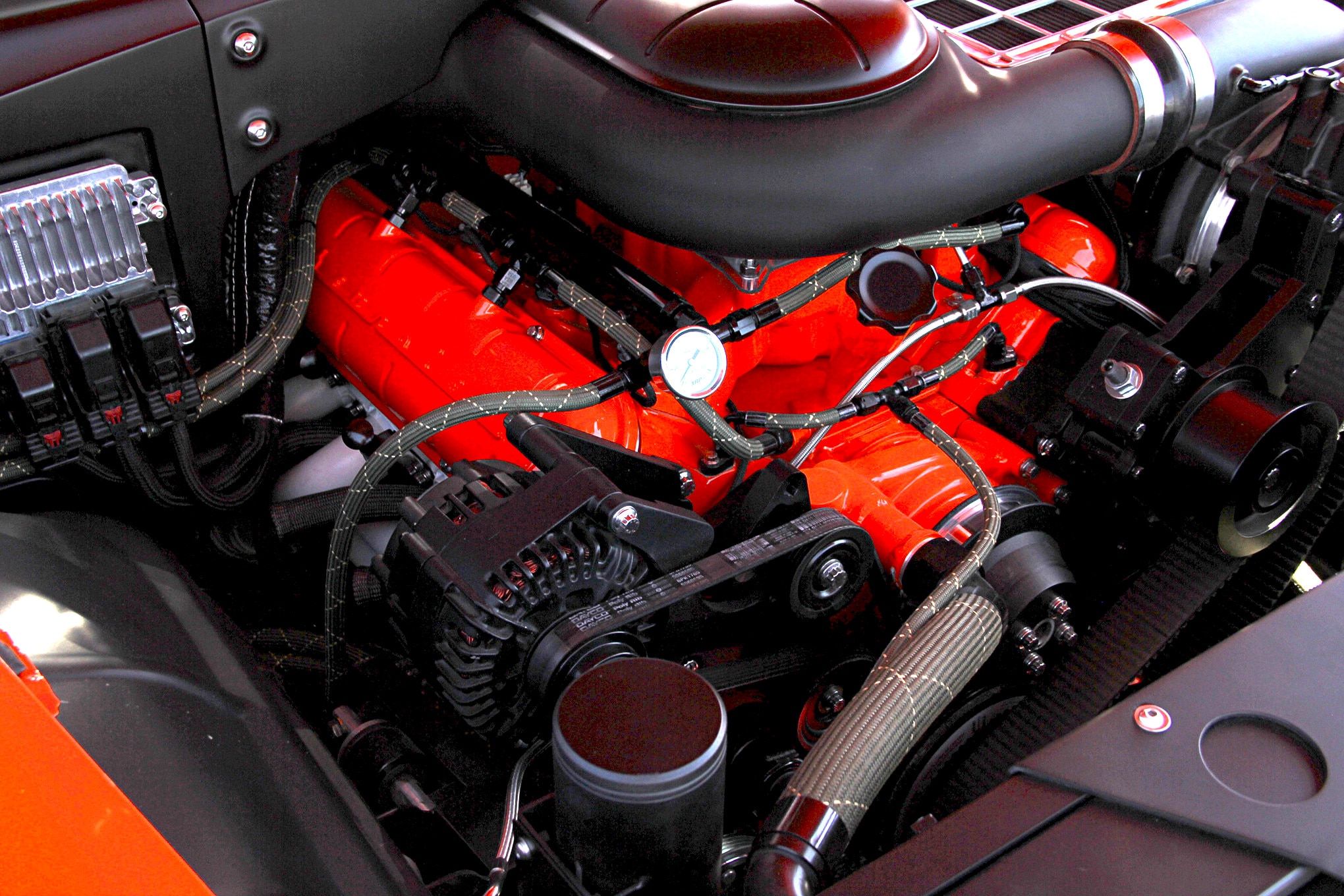 The white lines are called tracer lines. Tech flex makes an expandable hose cover that was probably used on the radiator hose. Should be easy to hunt down on google.