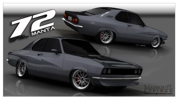 I have decided to start something a little different! i sold my 67 nova and got a little opel to mess with, it is a 72 manta which, although not too common in the usa they are definately rare in canada as they were not available for sale here, hoping to put a small turbo lump if possible , ecotec or nissan sr20 det etc, the car is only 2100lbs so doesnt need much motor, but dimensionally the ls1 is an easier fit! as the 4 bangers are all tall with front sump oilpans, i also want to go the irs route if i can sort something narrow enough, (50" track width!) and may need to graft new suspension on front to get bigger brakes etc, i got shawn mascoll to do a rendering and this is what he came up with, any comments appreciated
