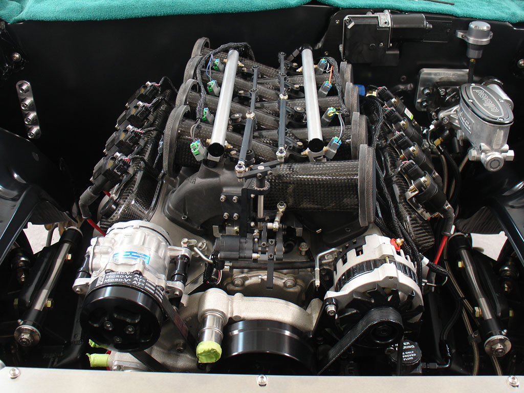 You can see the 8 stainless lines and the stepper motor and airfilter in the manifold. We since relocated the stepper motor down near the oil pan.