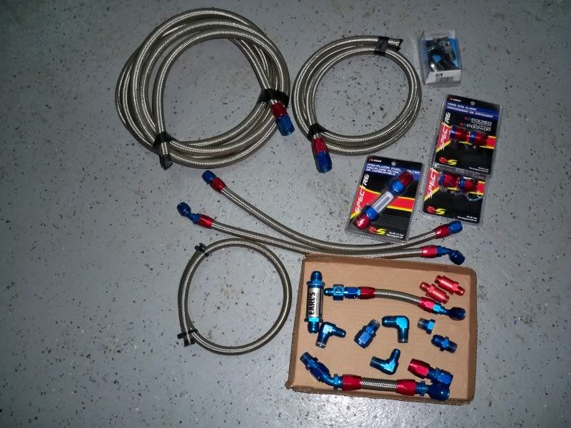 *SOLD* 3/8 & 1/4" braided stainless fuel hose & related fittings. 3/8 is in 12.5' & 5.5' in length. Originally in chevelle w/ 3/8" from tank to pump, pump to regulator on front inner fender w/ dual 1/4" to carb, related Earls fittings (including 3/8 NPT plug & fuel gauge adapter, 3/8 Russell inline filter, carb inlets and 3/8 barb style Spectre inline filter (brand new), Spectre hose clamps (new) and mounting clamps. $125 shipped for everything.