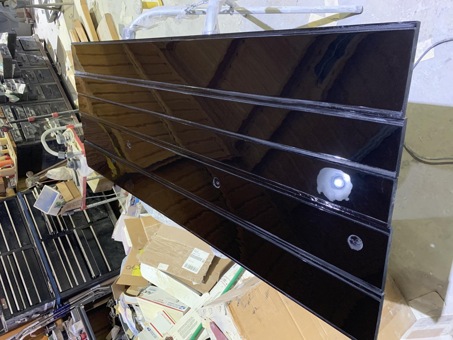The bed wood is cheap yellow pine and was sealed with epoxy and then I applied six coats of SPI black single stage which was then cut and buffed. I told my wife I was shooting for a piano finish. Close, but no cigar….