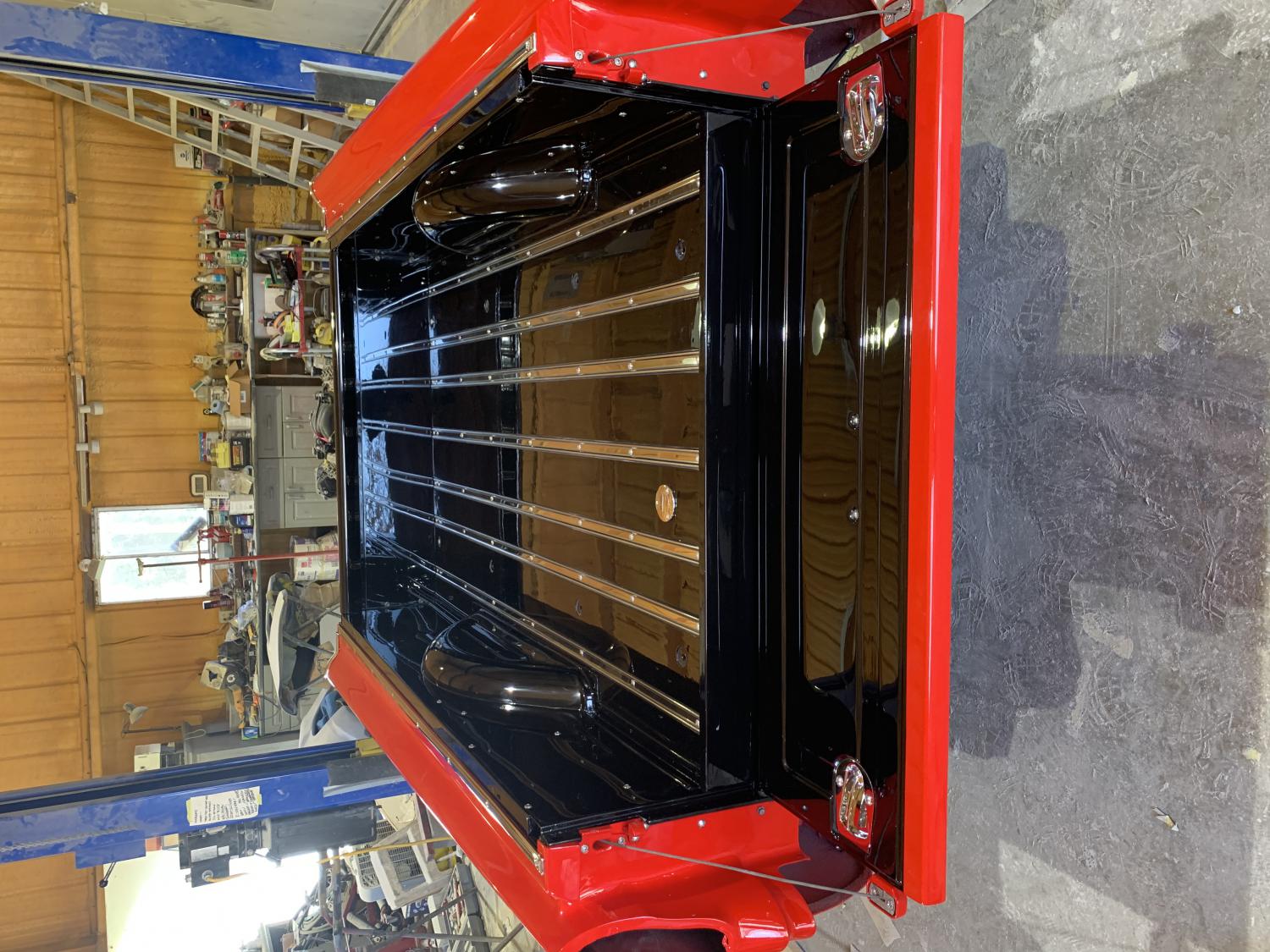 The bed was then assembled. Cameo pickups use retractor cables and tailgate latches instead of the usual chains and hooks.