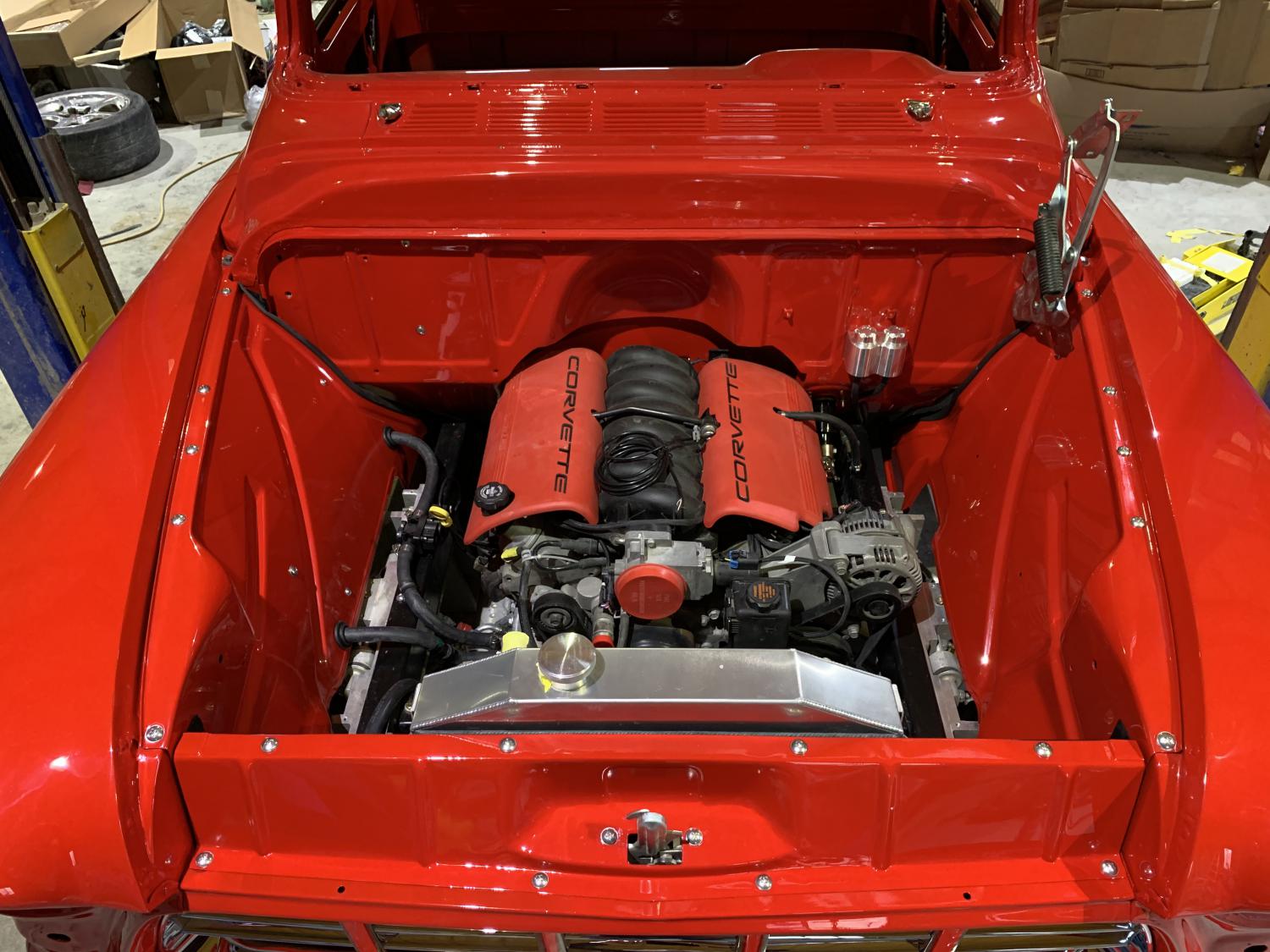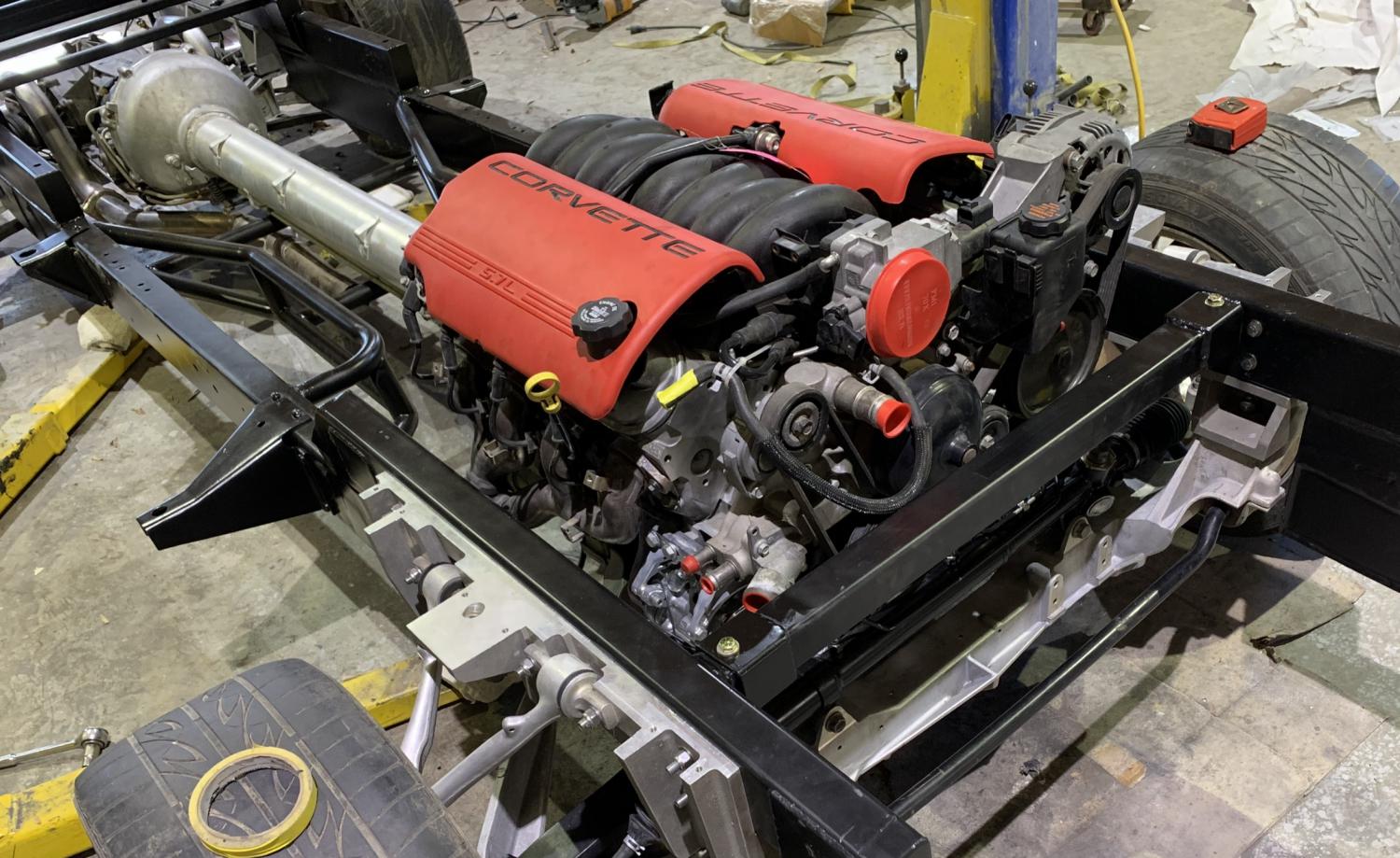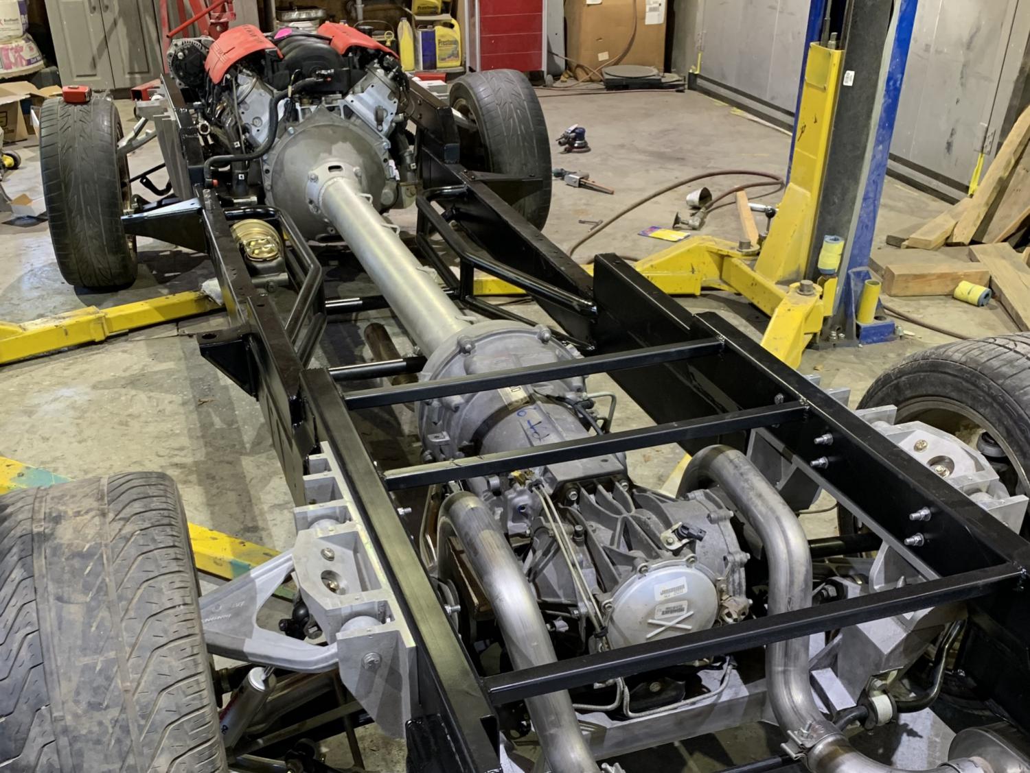 Final frame with drivetrain installed. The only non OEM Corvette parts are the Ridetech shocks. Springs, sway bars, rack etc are all C5. The C5 motor mounts and batwing oil pan are also used. I also found a used C5 Corsa exhaust system that I will use with extended tail pipes. Looking forward to that Corsa sound.
