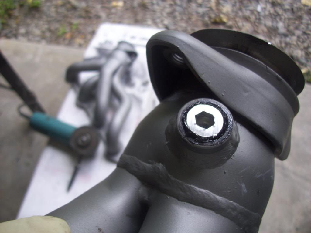 The only rub is that the o2 sensor bung aims right at the crossmember. Well, even an allen bolt plug stuck out too far, so I took a cut off wheel to it and gooped up the threads with exhaust adhesive that becomes cement when heated up. We'll put the actual bungs in just a couple inches downstream out of the way.