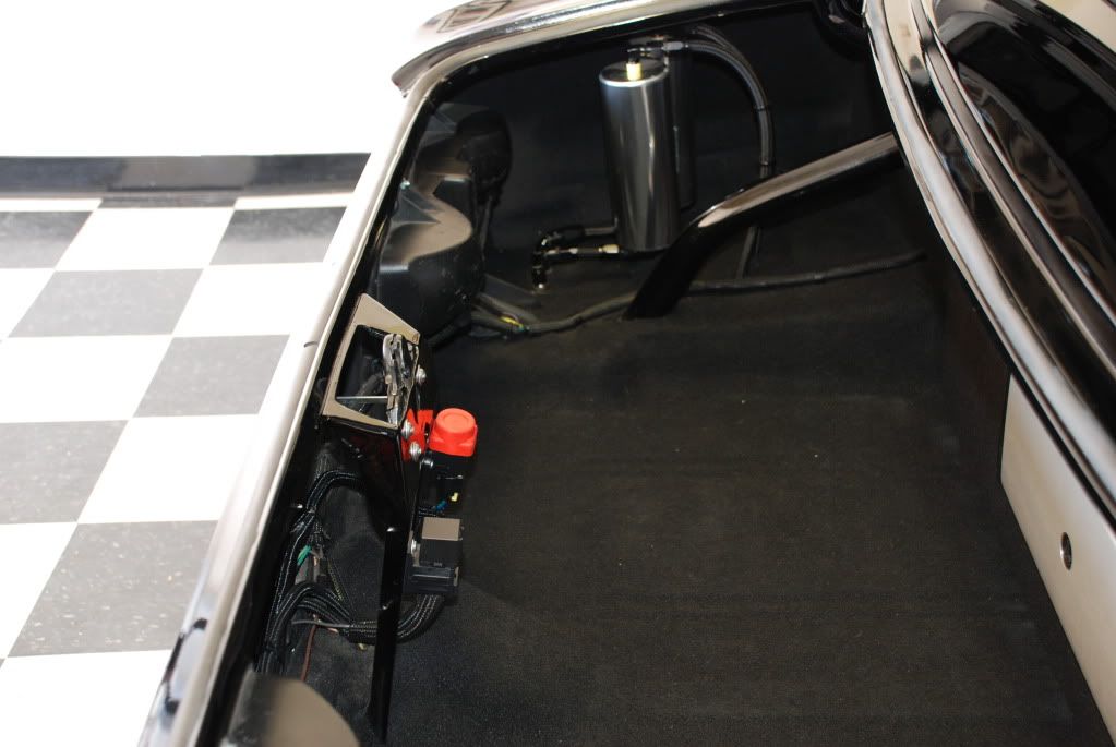 The second thing I added is a ROLL OVER SWITCH. I wired it into the ground side of my fuel pump relay. The car must be upside down for this switch to cut the ground to the relay. While I hope to never test this one out, I wouldn't want to be upside down with 140 per hour flowing. It's the red capped switch next to the fuel pump relay. I wired it so that if it malfunctions, I can simply uplug the connections and bypass it. The switch is made by painless.